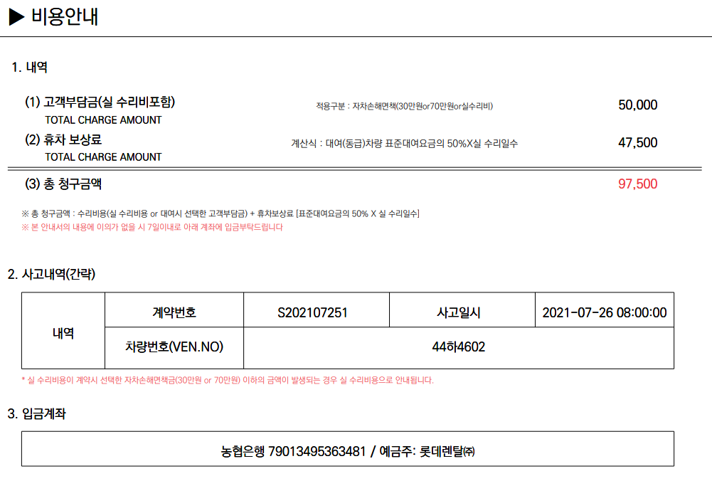 휴차료는 정말로 차량 정비에 들어간 시간만 계산해서 청구 된다고 했어요.