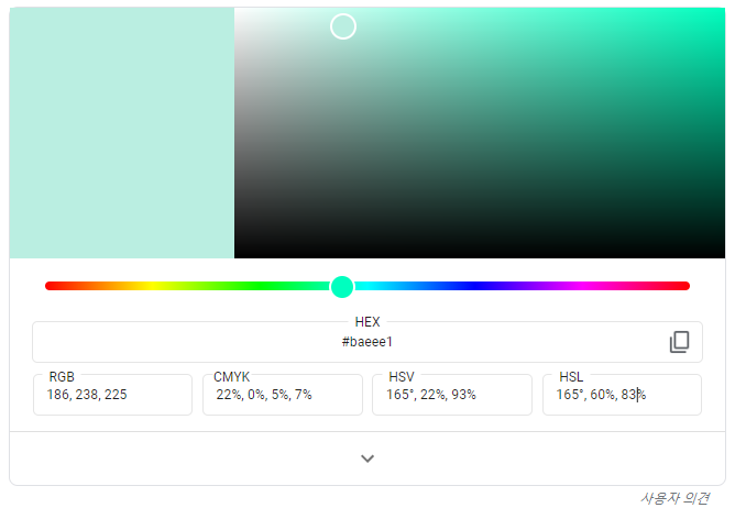 컬러를 바꾸는 방법은 hsla(165, 60%, 83%, 0.5) 이 부분을 바꾸는 건데요. hsla는 hue(색상), satuation(채도), lightness(밝기), alpha 값을 바꾸어주면 되는데, 색상은 0-360 / 채도는 0-100 / 알파는 0.0~1.0(0은 완전투명, 1은 불투명)