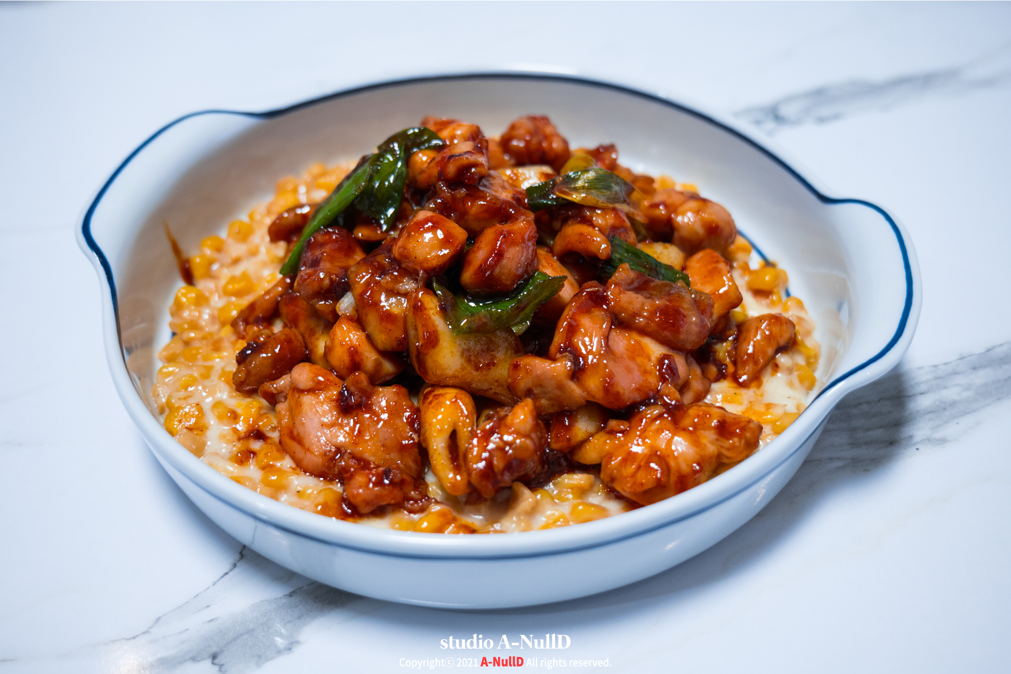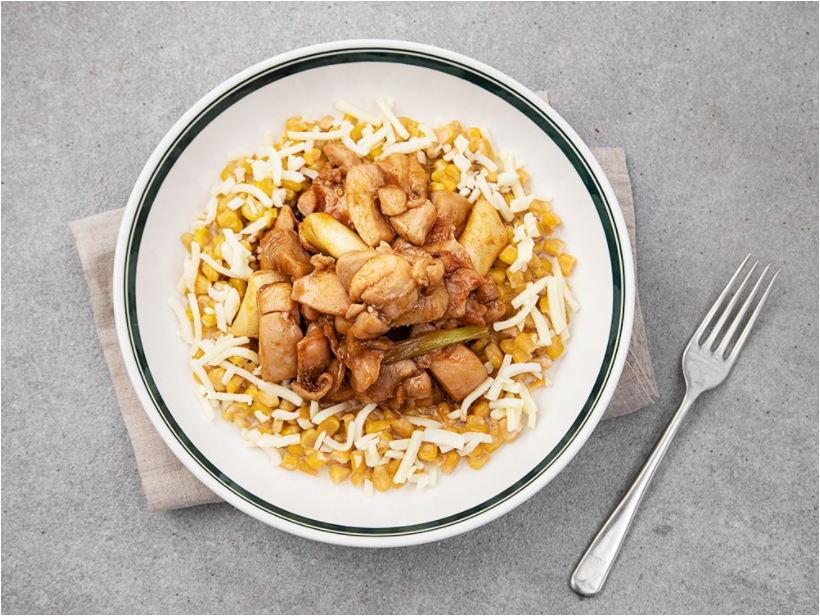 그릇에 콘치즈를 깔아주고 그 위에 바비큐치킨을 올려줘요.