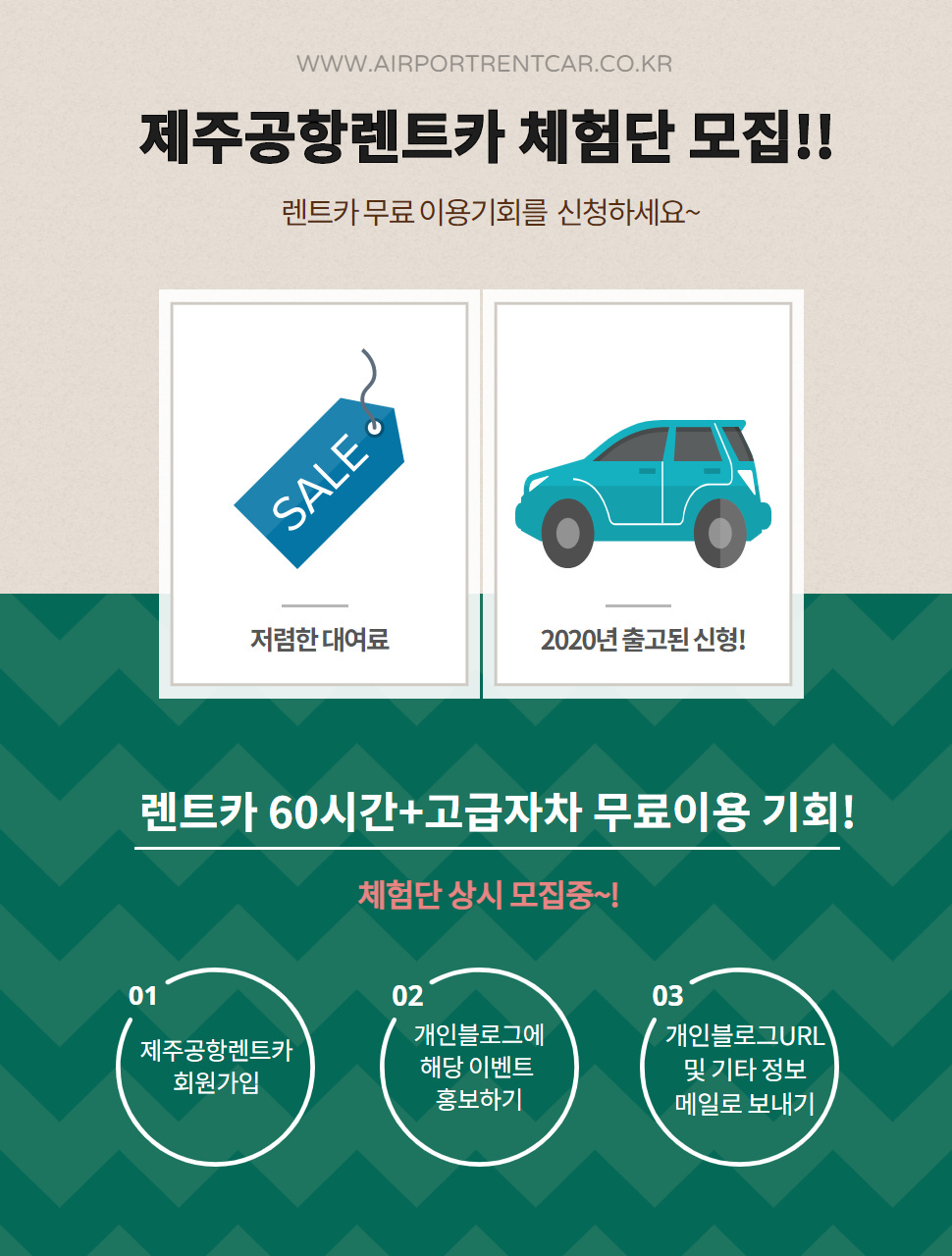 3. 개인블로그 URL과 사용예정기간, 사용예정인원, 신청이유작성하여 이메일접수!(admin@airportrentcar.co.kr)