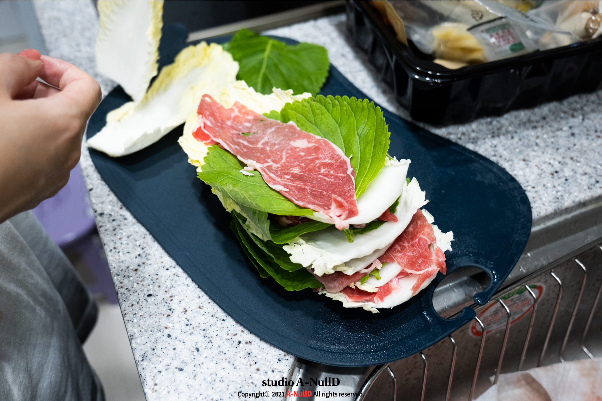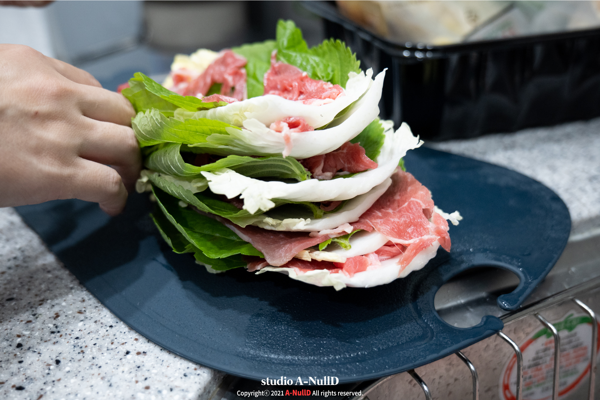 고기와 야채를 층층이 쌓아줍니다.