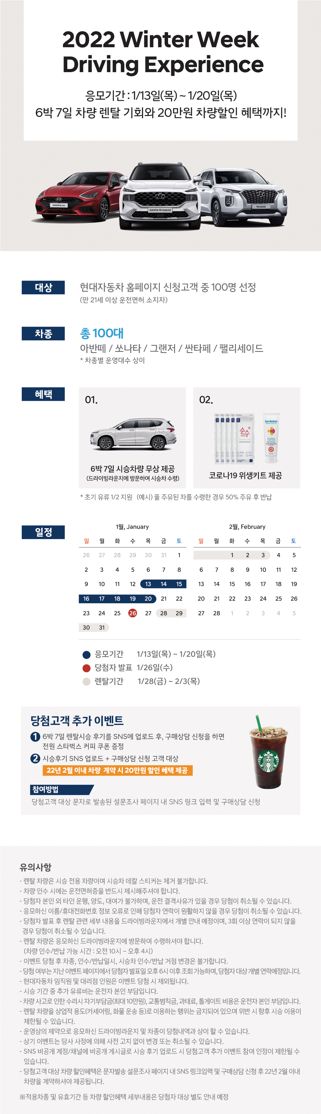 2022 Winter Week Driving Experience 응모기간 : 1/13일(목) ~ 1/20일(목) 6박 7일 차량 렌탈 기회와 20만원 차량할인 혜택까지! 대상 : 현대자동차 홈페이지 신청고객 중 500명 선정 (만 21세 이상 운전면허 소지