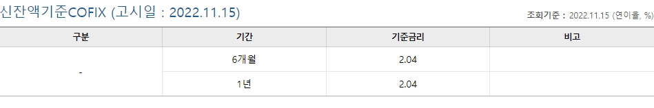 11월 15일 기준 신잔액기준 COFIX 6개월은 2.04% 입니다.