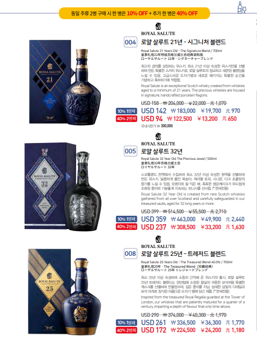 처음 한병 구입했을때는 10%, 두병 구입했을때 두병째는 40% 할인가격에 판매합니다. 총 183,000(10%)+122,500(40%) = 305,500 구매 가능합니다.