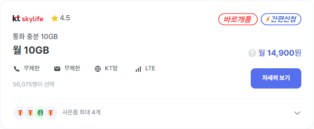 데이터 월 10GB 에 통화와 문자 무제한 입니다.