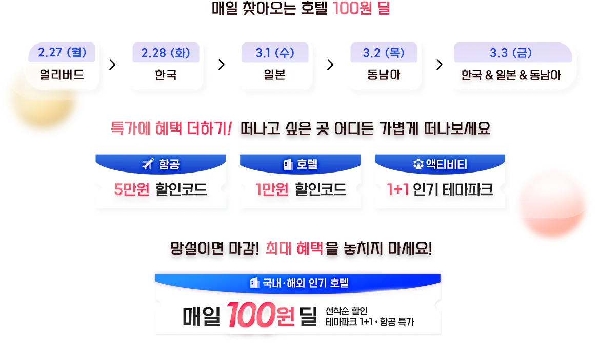 매일 찾아오는 100원 딜 외, 선착순 할인코드·테마파크 1+1