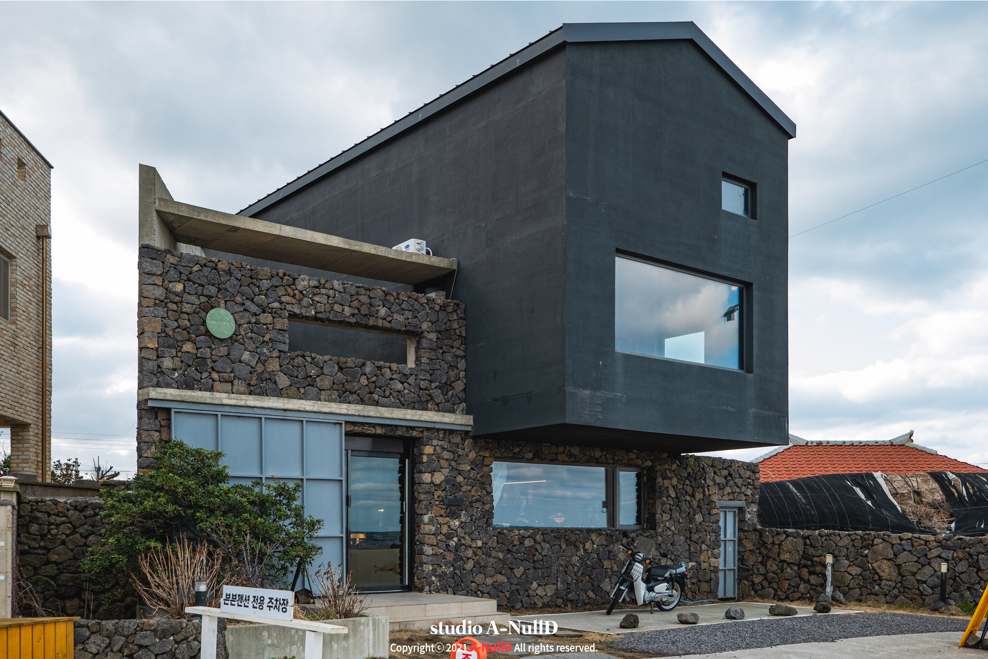 어둡지만 제주의 현무암 색을 닮은 외부전경.