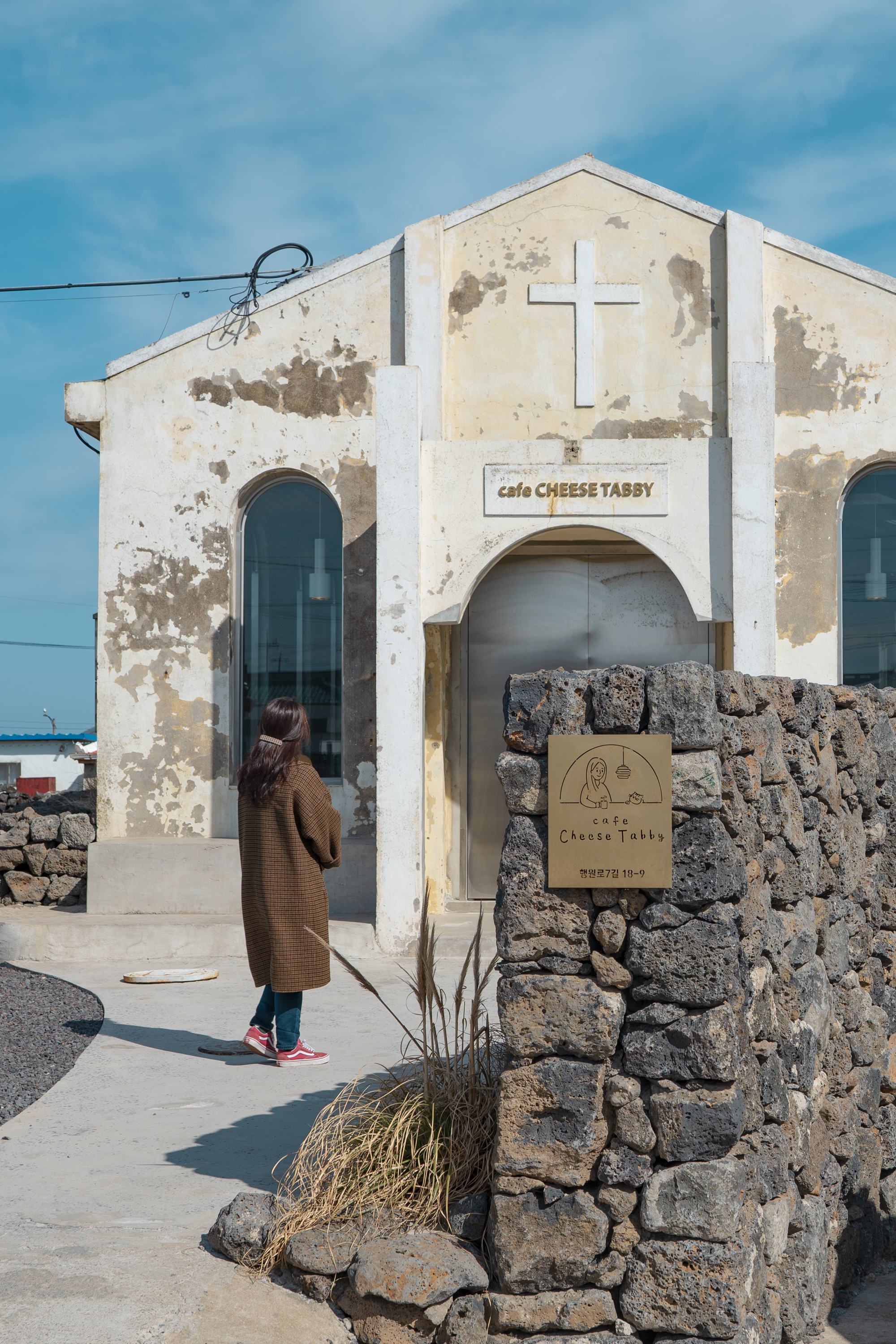 세모라고 주먹밥 집에서 포장을 하고나서 근처라서 후기를 보고 찾아간 카페. 위치는 제주 구좌읍에 있어요. 외관이 오래된 성당? 느낌처럼 꾸며놓았어요! 신기하죠? 칠이 벗겨진 느낌 조차도 왠지 연출 같은...
