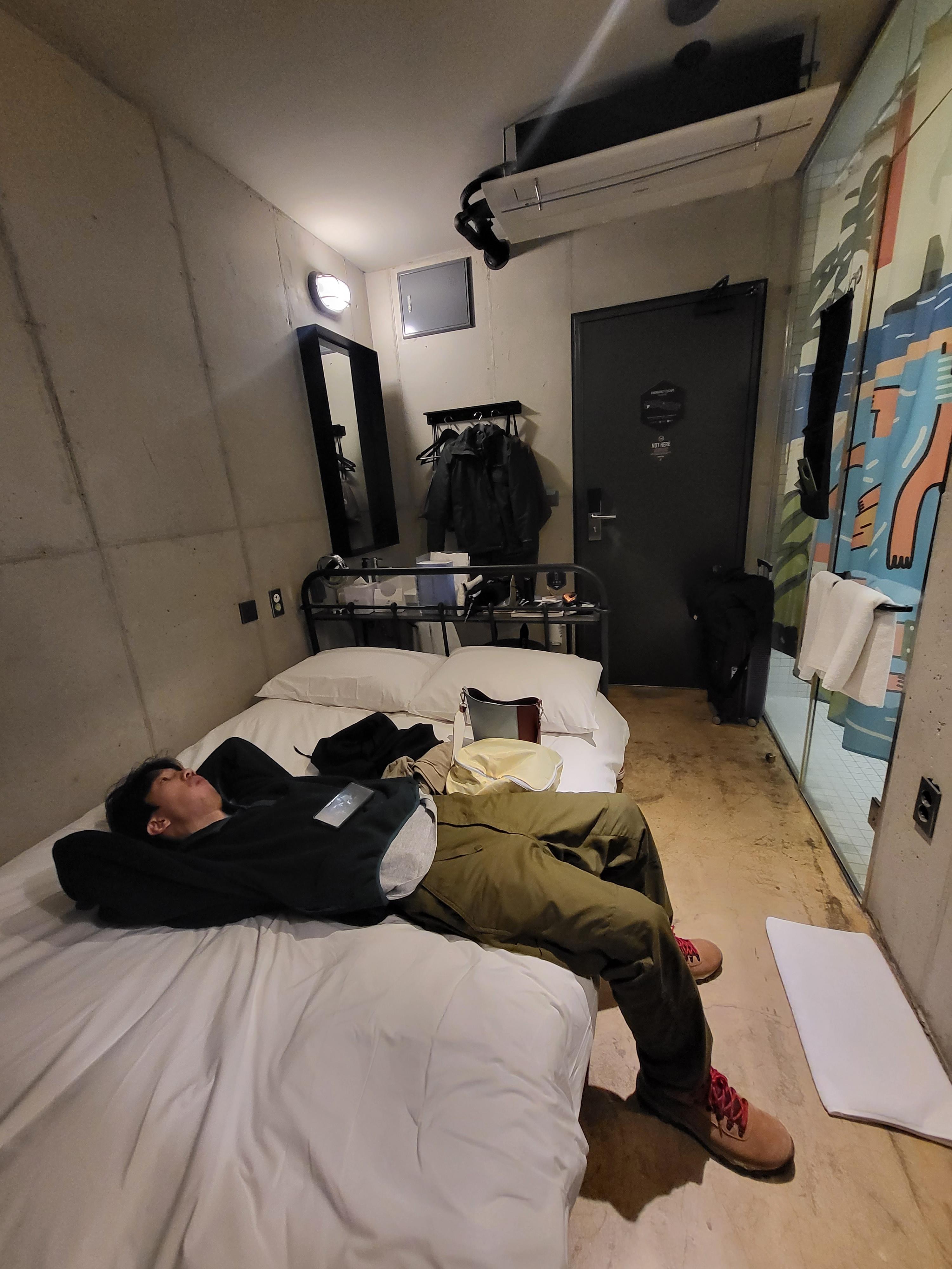 침대 하나 덩그러니 있구요. 캐리어 2개는 다 열어놓을 공간 조차 없어요. 그리고 어느 숙소에도 있는 흔한 티비조차 존재하지 않는 곳입니다.(미니멀하죠? 사실 이 정도를 생각하진 않았다고요.)