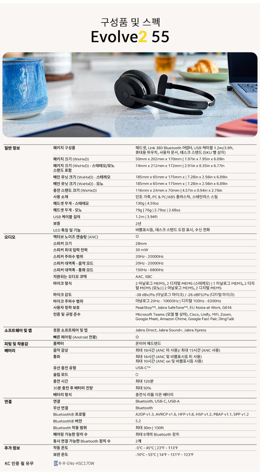 자브라 Jabra Evolve2 55 Stereo 하이브리드 차세대 업무용 무선 헤드셋 액티브 노이즈 캔슬링 블루투