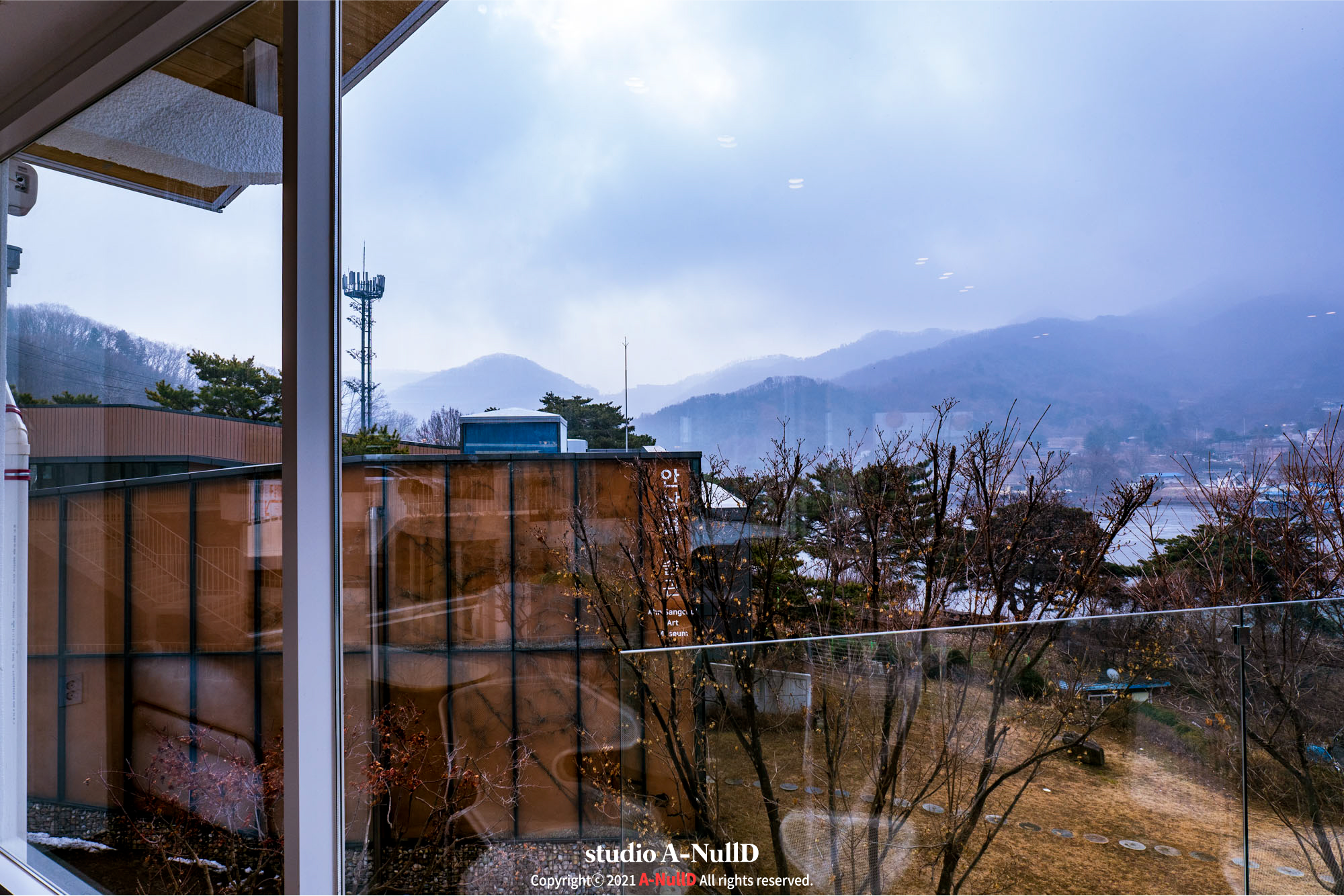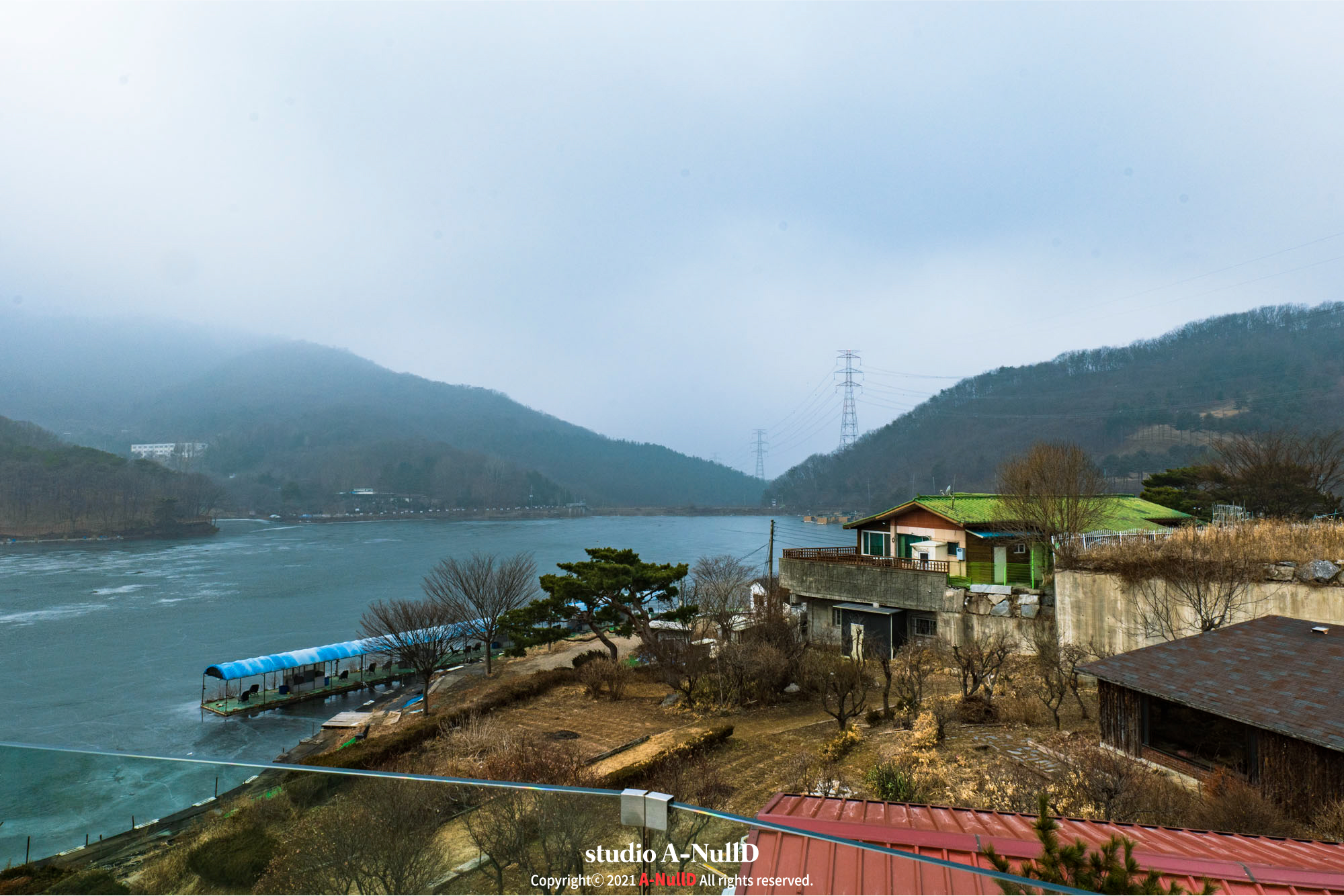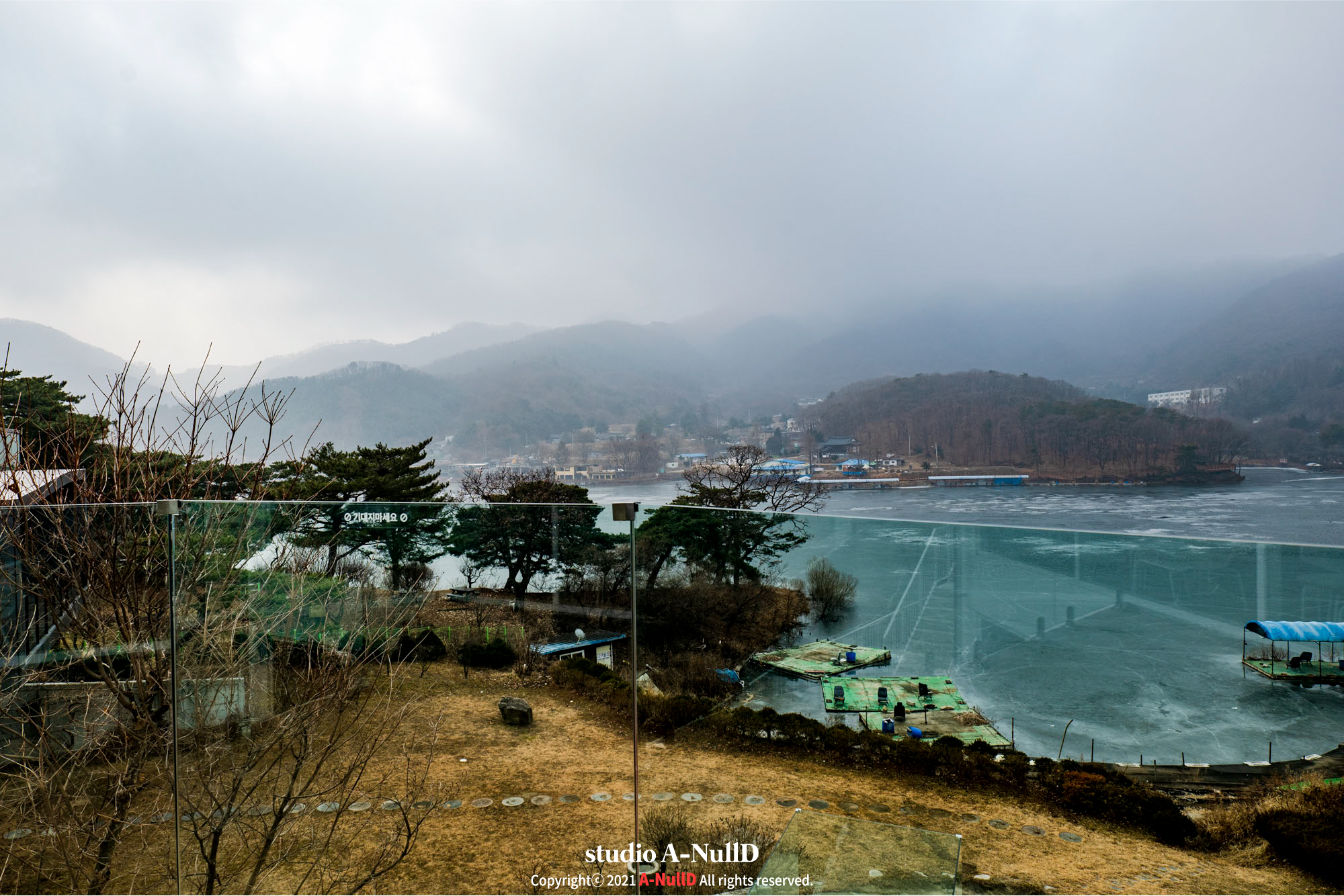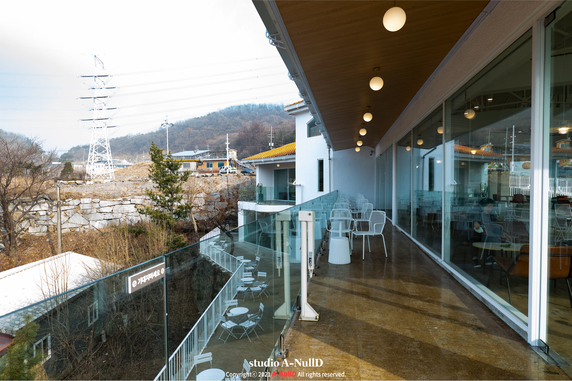 2층외부에서는 기산저수지가 보이는데, 겨울이라 조금 휑하긴하지만...