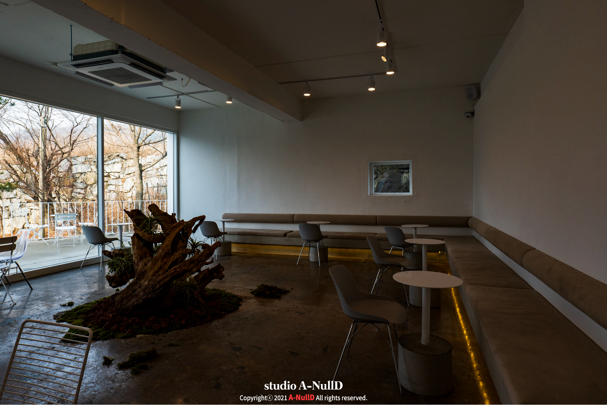 특색 있는 카페 내부, 유목을 활용한 인테리어도 그럴듯 해보였고, 1층에서도 내부와 외부를 연결하는 다양한 공간들이 있어서, 날씨가 풀리면 바람쐬기도 좋아보였다.