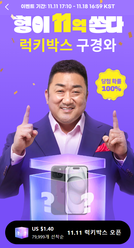11. 11 럭키박스 이벤트는 알리익스프레스 어플을 통해 접속이 가능하며, 11월 11일 오후 5시부터 18일 오후 4시 59분까지 진행 됩니다. 또한 선착순으로 진행됩니다.
