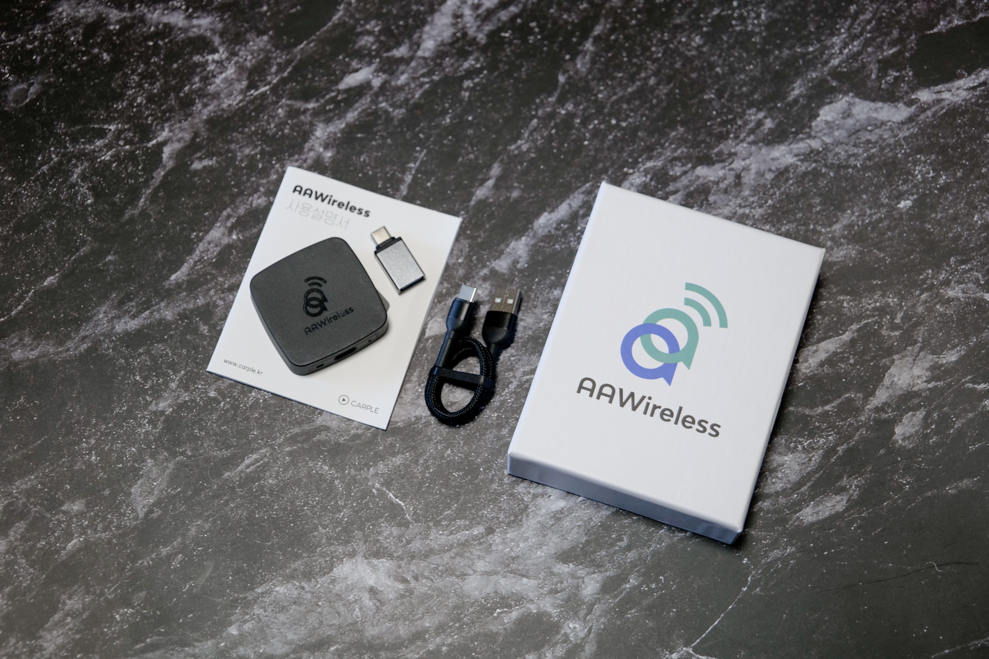 하지만 우연한 기회가 있어서 AAWireless 라는 기계를 체험 받게 되었습니다. 중국발 아니고, 유럽발 제품이네요. 제품이 유럽에서 만들어졌어요. 구성품은 제품 본체, C TO USB-A 케이블과 USB-A TO C 젠더.