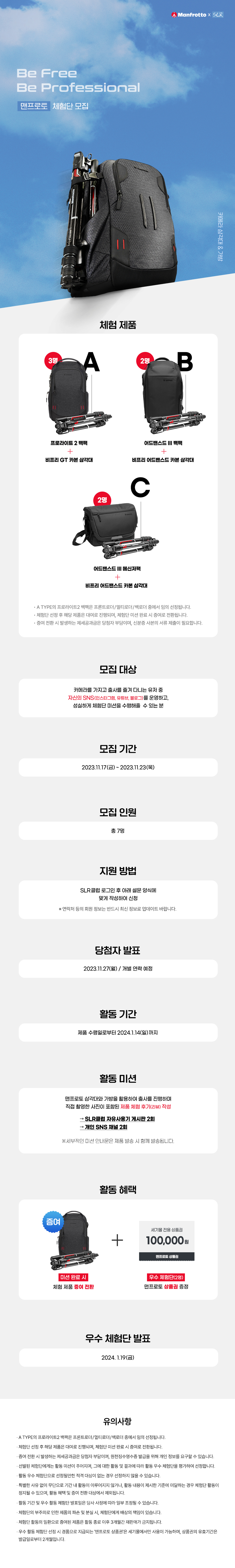 체험 후의 체험 제품을 증정해주는 베네핏도 참 좋고, 체험할 수 있는 가방이나 제품들도 출시가 오래된 제품이 아니어서 상당히 메리트가 있어 보입니다. 심지어 삼각대도 모두 카본 삼각대네요. 제품체험도 하고 겨울에 움츠려들지 않고 나가서 사진도 찍으러 다니는 계가 될 수 있는 좋은 이벤트 같네요.