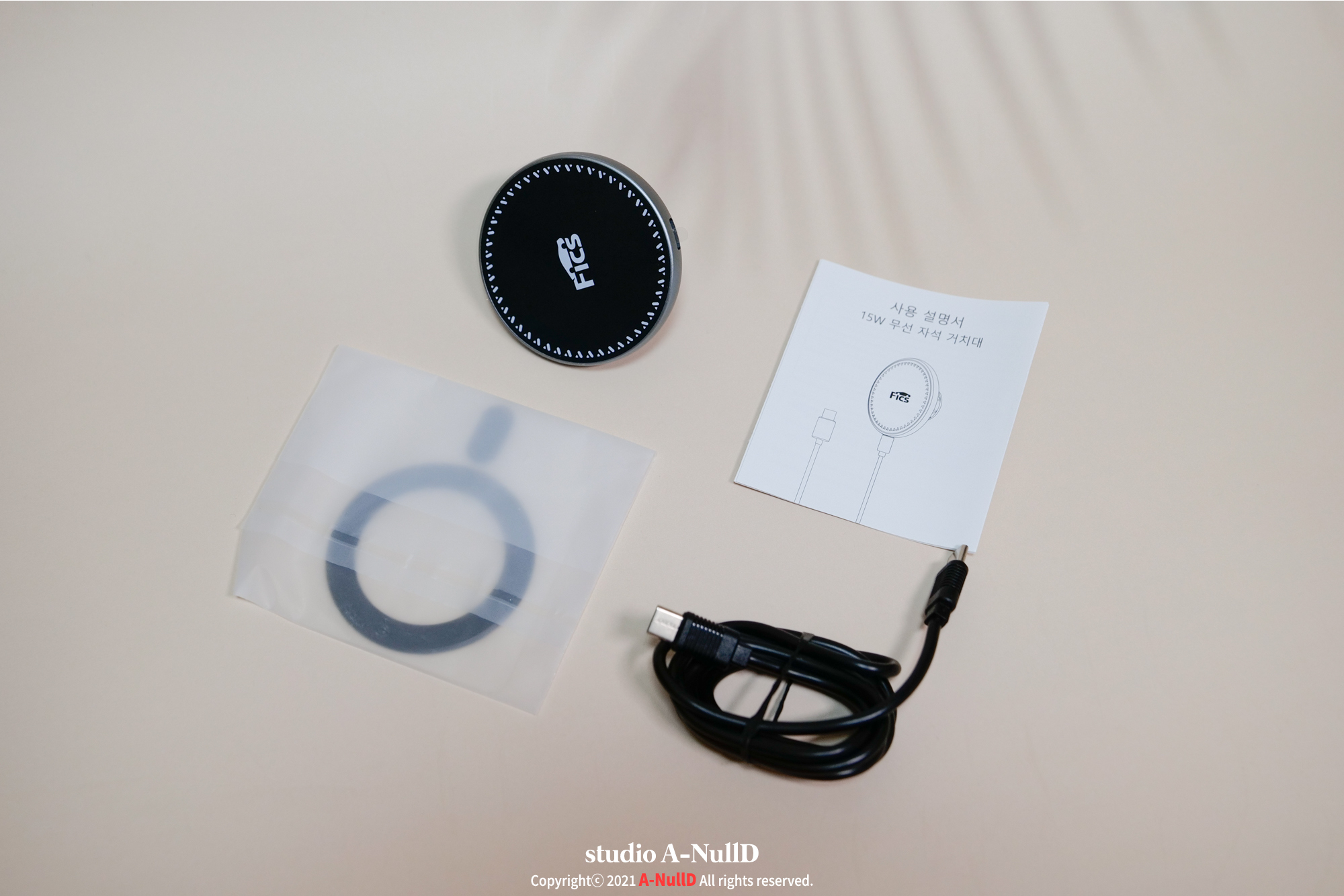 그리고 무선 맥세이프 거치대. 이것 또한 같은 픽스 제품입니다. 기기 본체랑, USB-C 케이블, 맥세이프 자석도 구성품에 있네요.