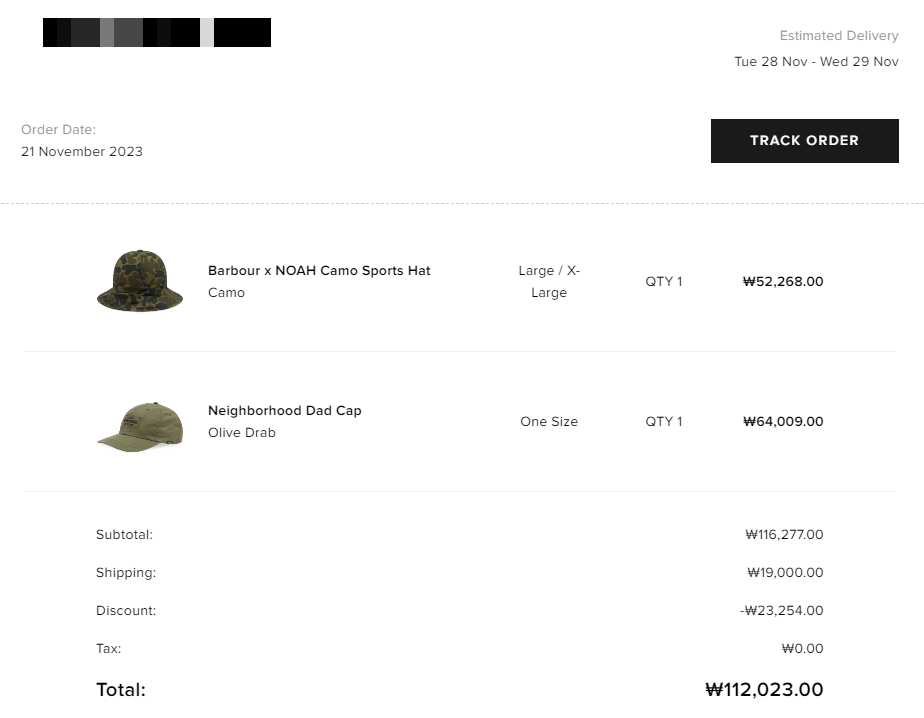 네이버후드 깔끔한 모자 하나랑 바버x노아 콜라보 모자를 하나 샀네요. 이중환전으로 최종결제는 113708원이 결제 되었어요. 1685원 가져감.