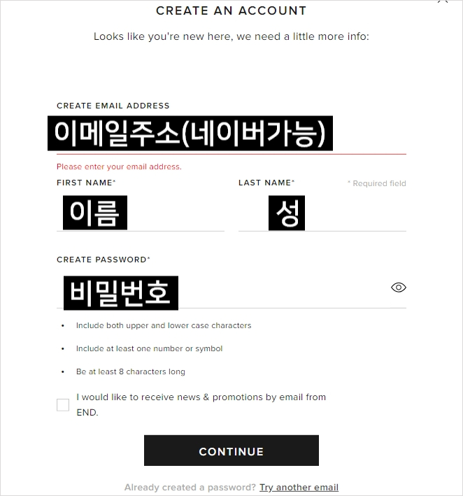 이메일주소로 가입을 하며, 비밀번호는 대/소문자, 숫자포함하여 작성합니다.