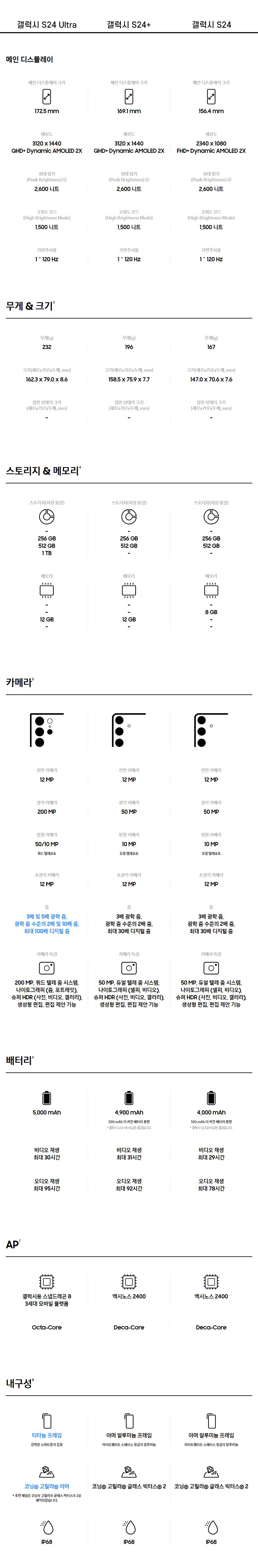 갤럭시 S24 시리즈 스펙비교