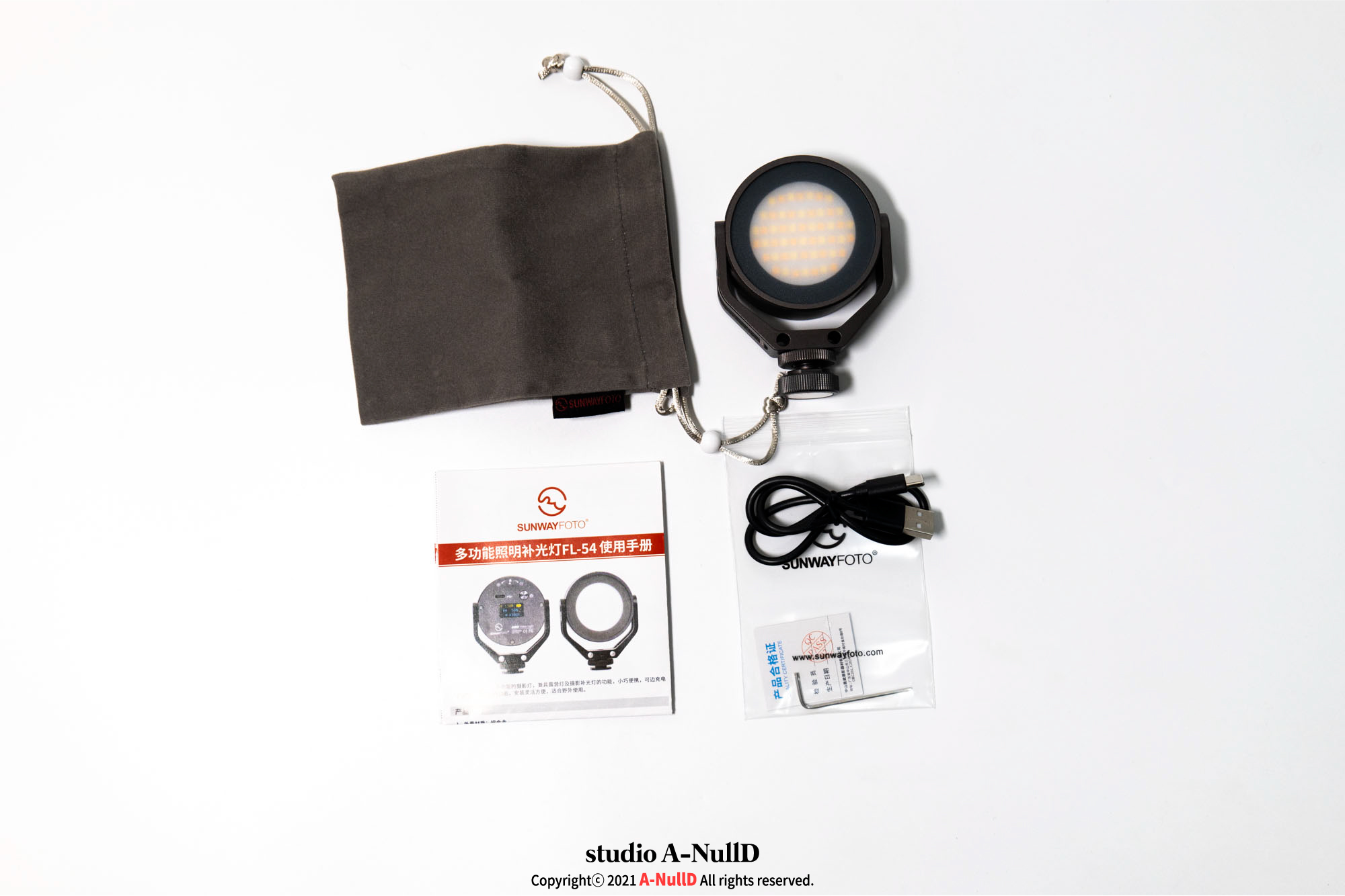 제품의 구성품은 FL-54 라이트와 설명서, 그리고 USB-C 타입의 충전잭 그리고 휴대용 포켓과 육각렌치가 동봉되어 있다.