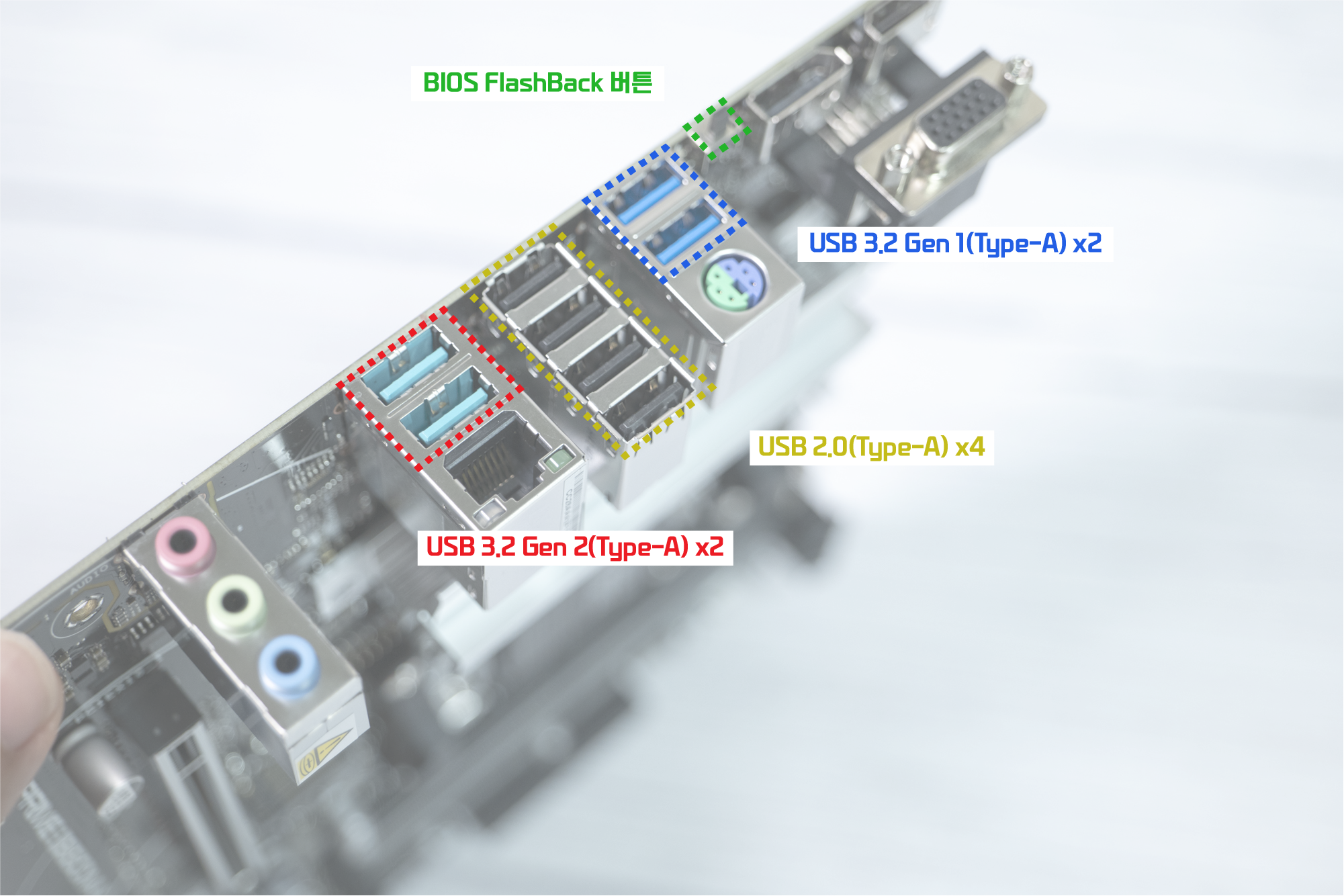 (좌측에서 우측상단으로) 후면 USB 3.2 Gen2 x2, USB 2.0 X4, BIOS FlashBack 버튼, USB3.2 Gen1 x2 구성. 바이오스 플래쉬백이 있어서 편하게 바이오스 업데이트도 가능합니다.