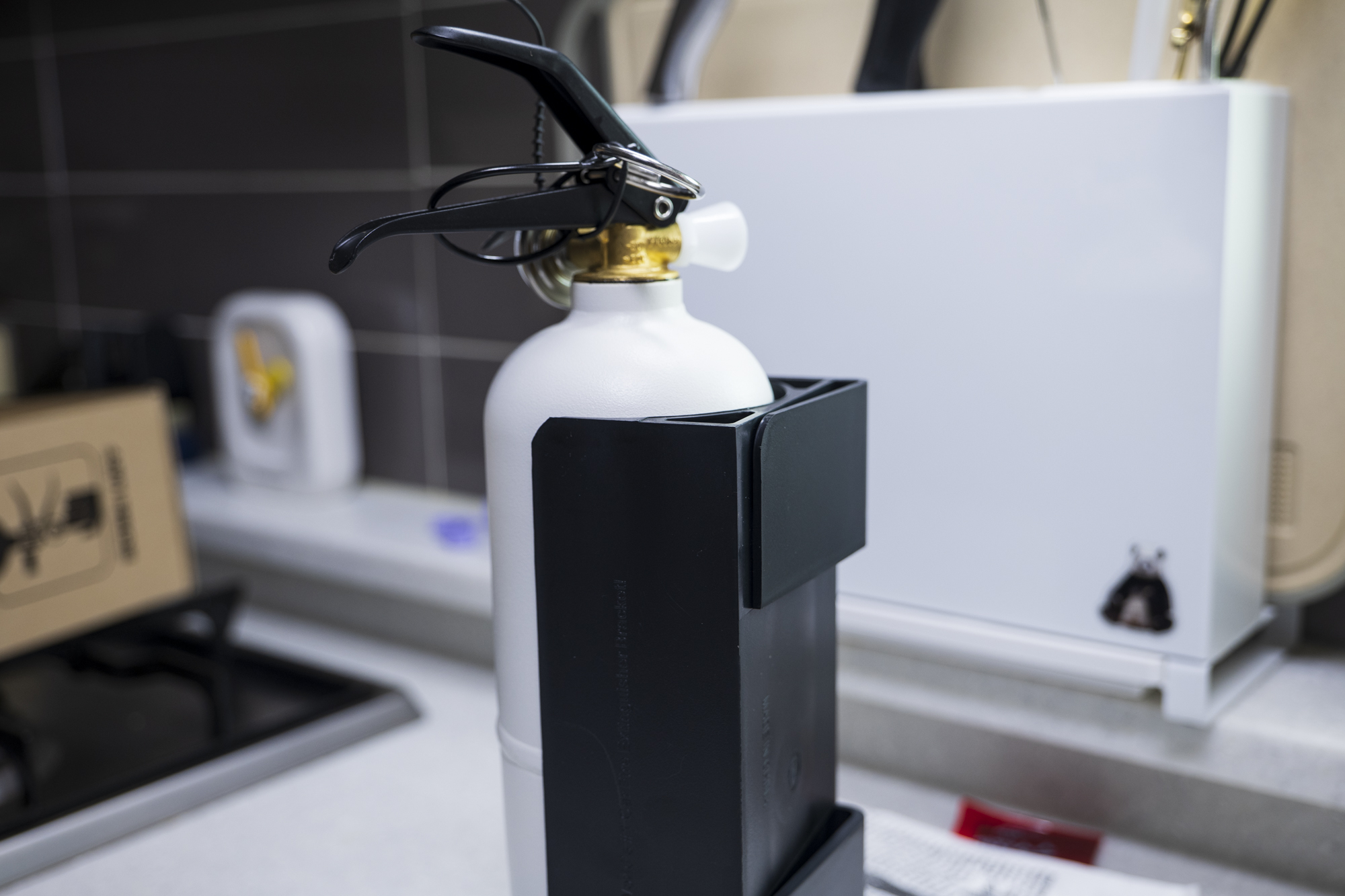 구입한 차량용 소화기는 용량은 1kg / 색상은 흰색이 조금 독특해서 구매하긴 했습니다. 세워두거나 거치가 가능한 플라스틱 재질의 거치대가 있긴 한데, 엄청 편리한 느낌은 아닙니다. 그냥... 저냥.
