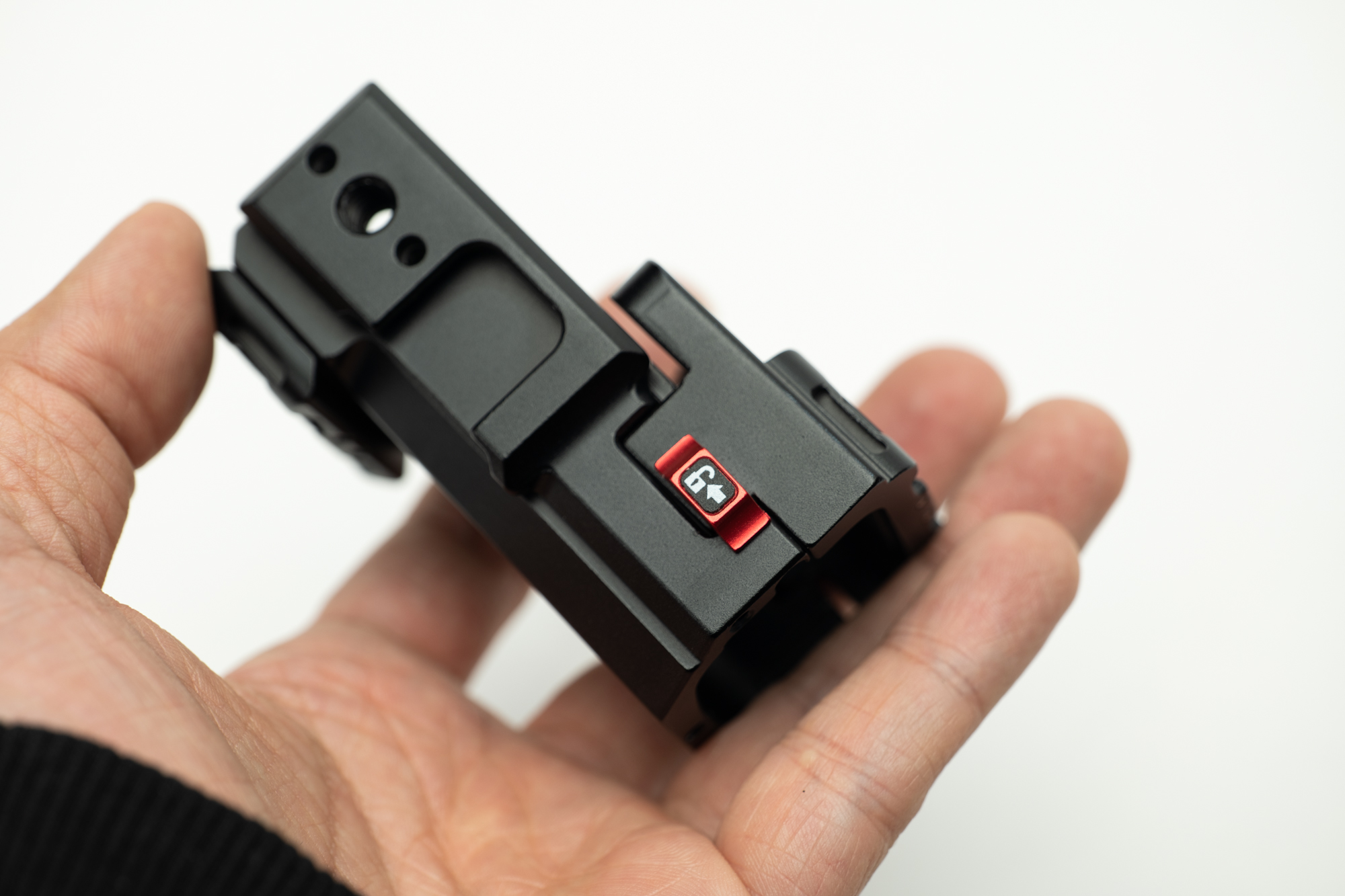 사이드에 레버를 잡아당겨서 장착하는 편리한 방식입니다. 근데 살짝 불안감이 있어요. 기분탓이겠죠? 좌측 콜드슈 사이즈의 마운트 있습니다.