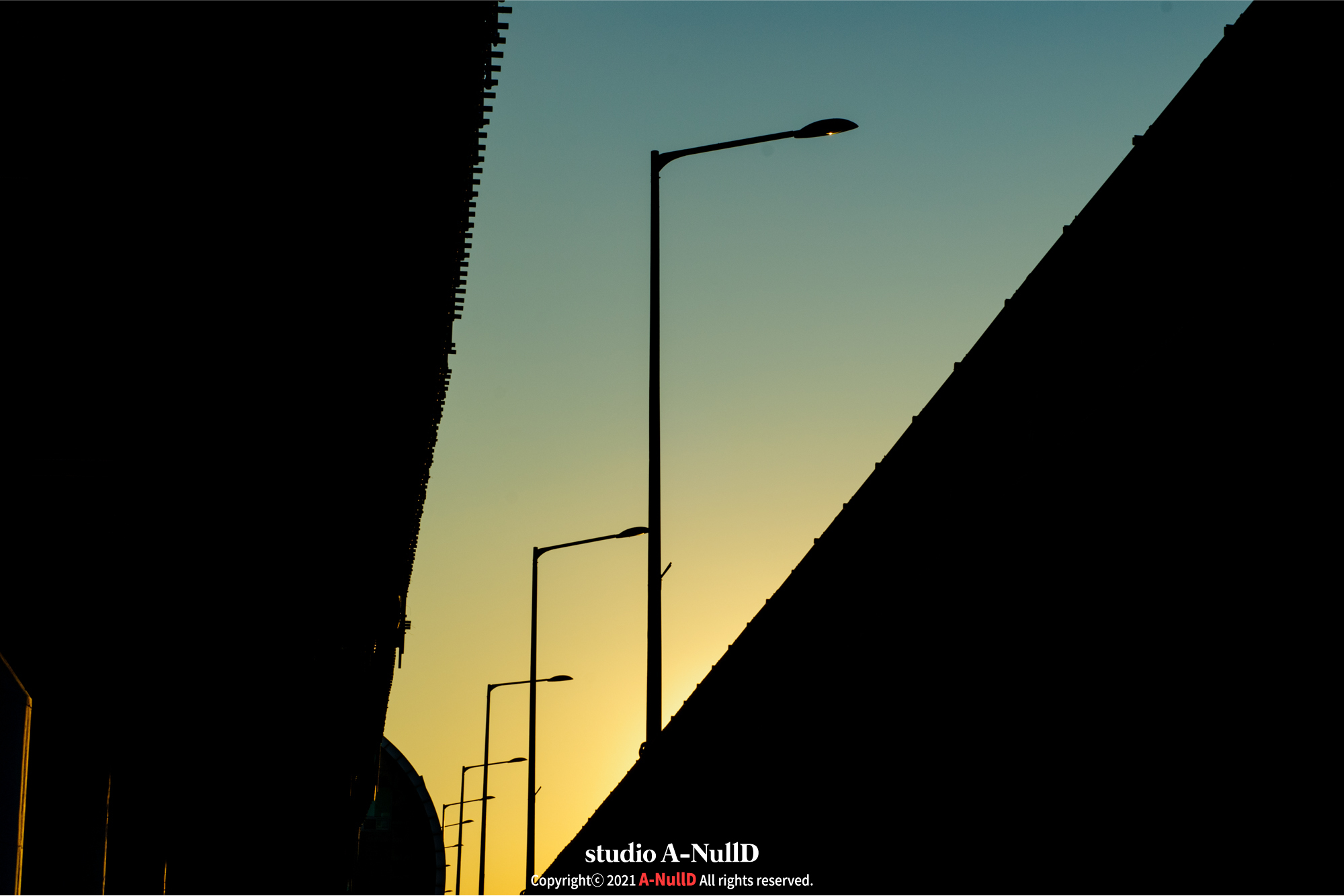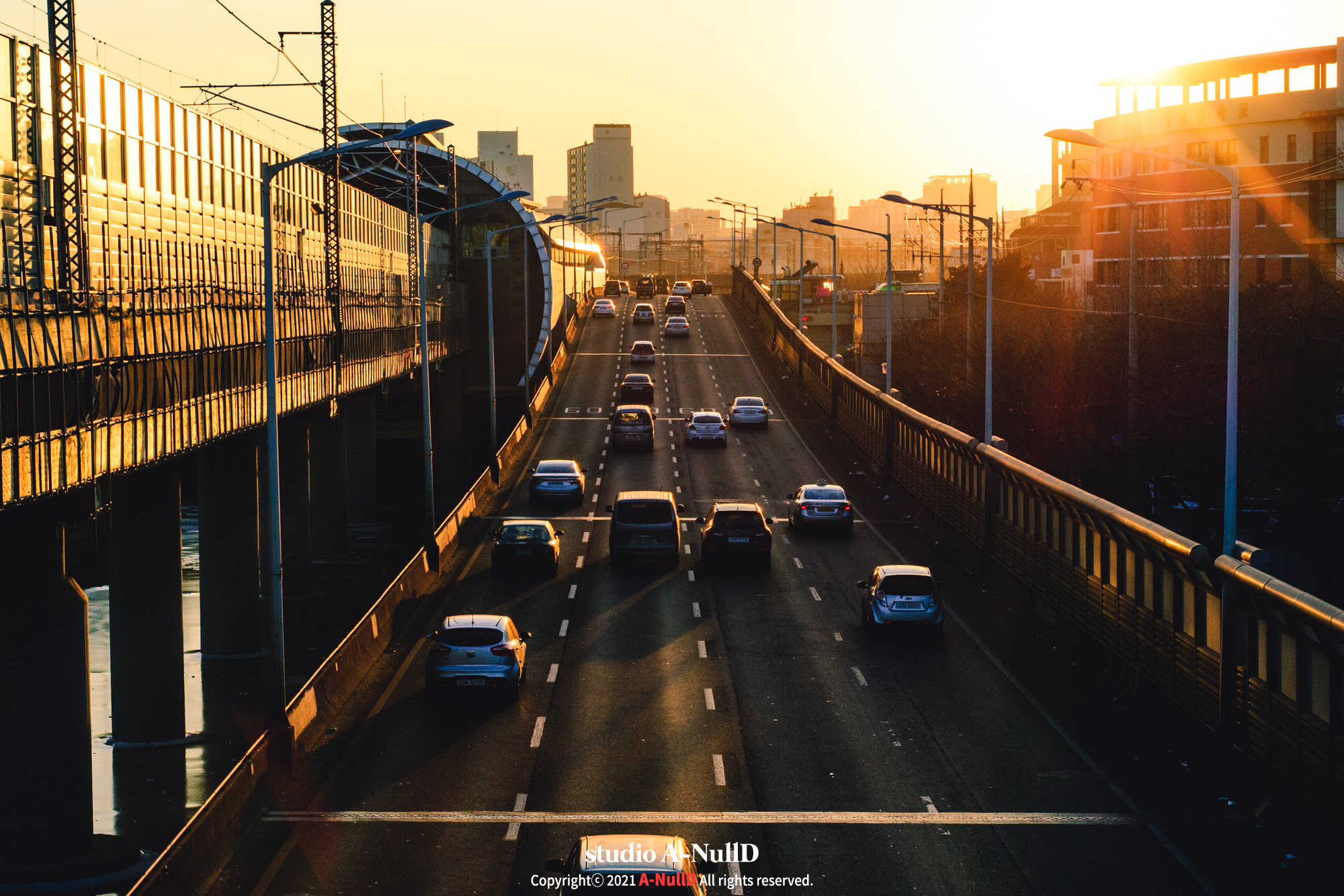 해질녘 도로 위. 붉은 태양광과 사선으로 떨어지는 그림자가 재밌다.