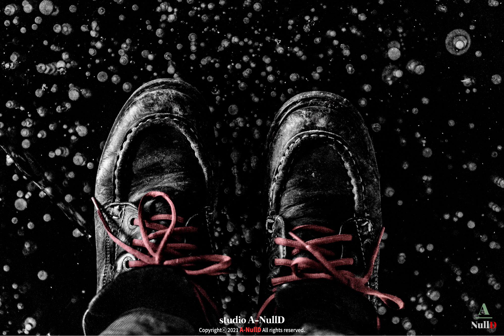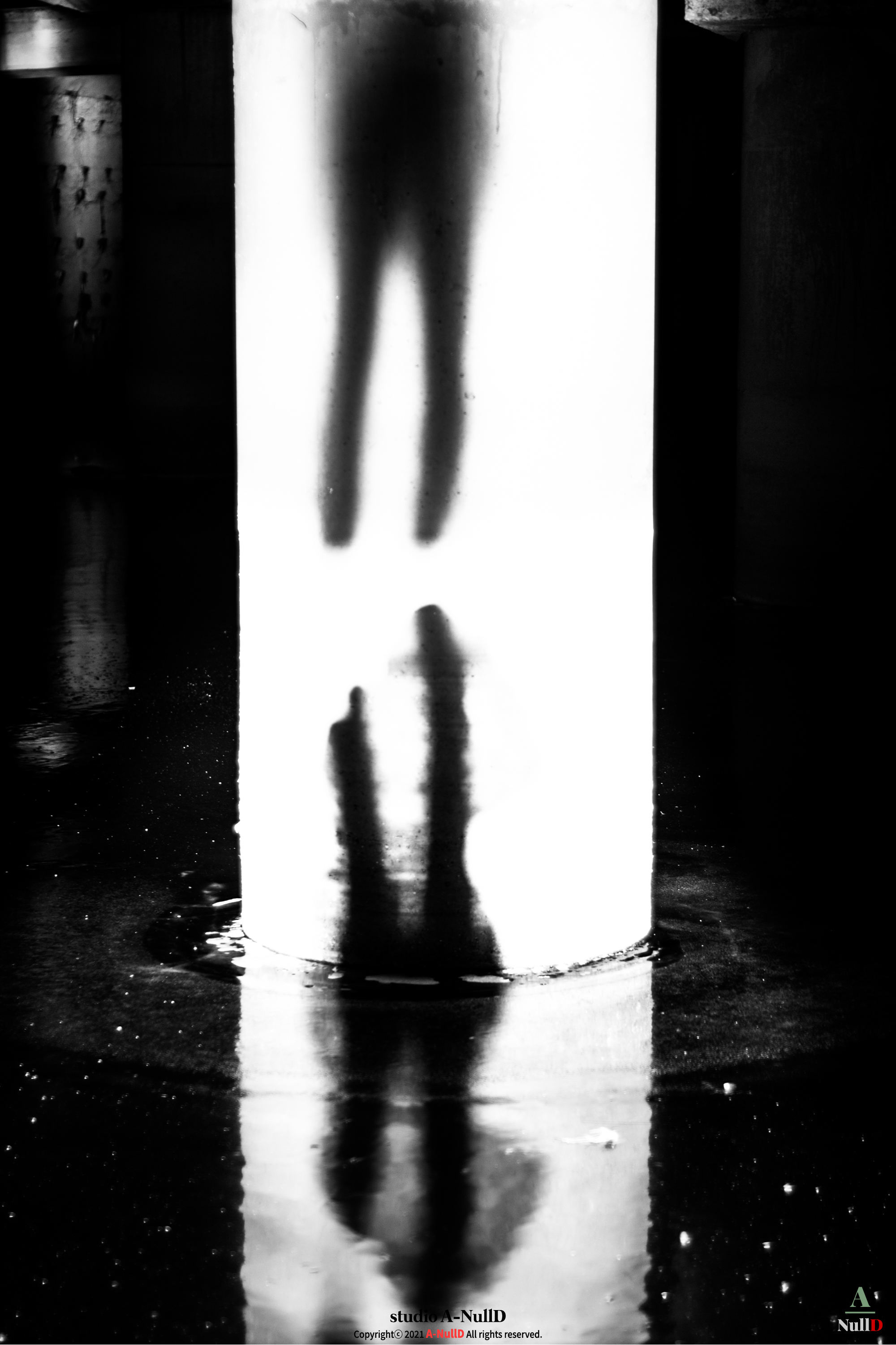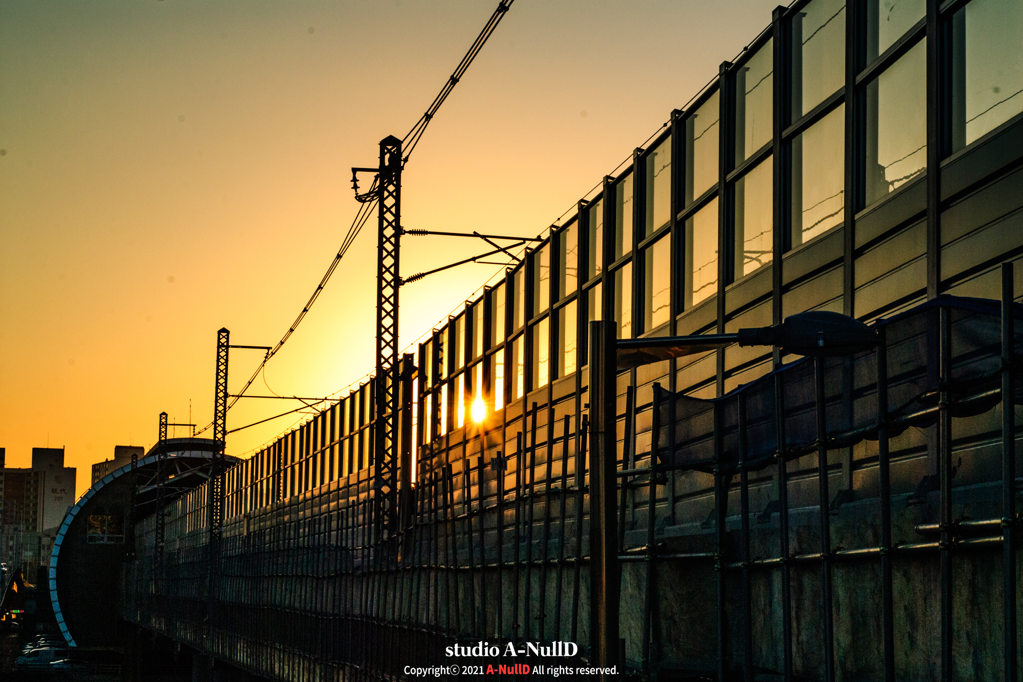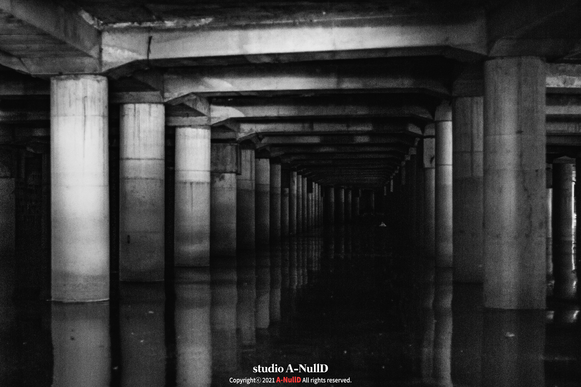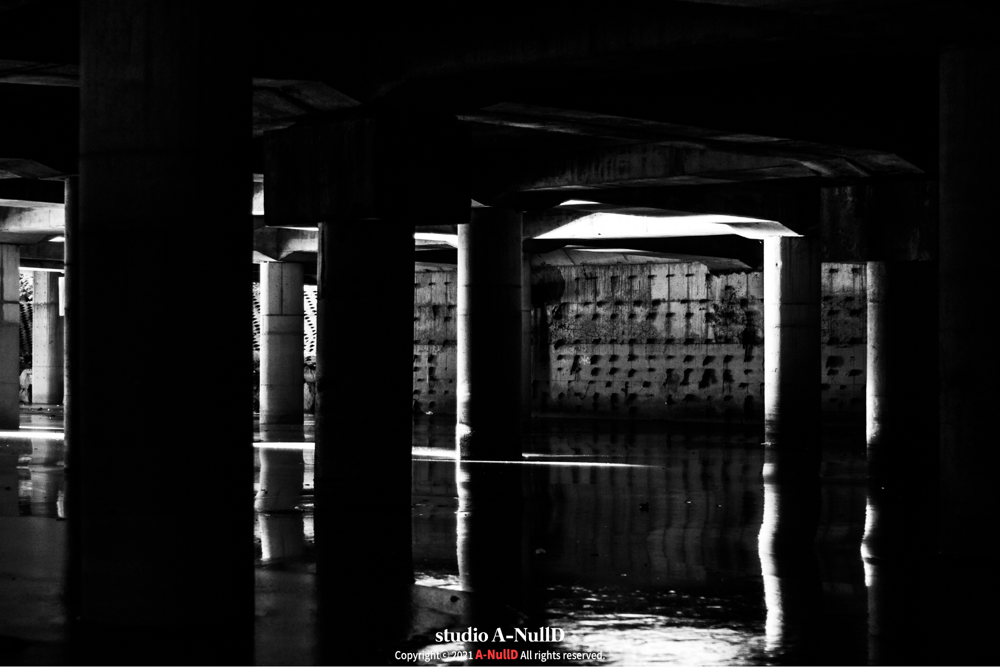 빛이든 교량의 기둥으로 빛과 그림자가 비추고, 빛과 그림자는 하천의 얼음에 반사 되었다.
