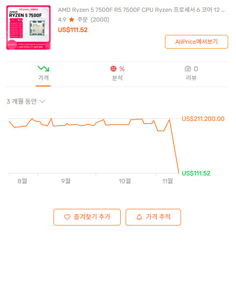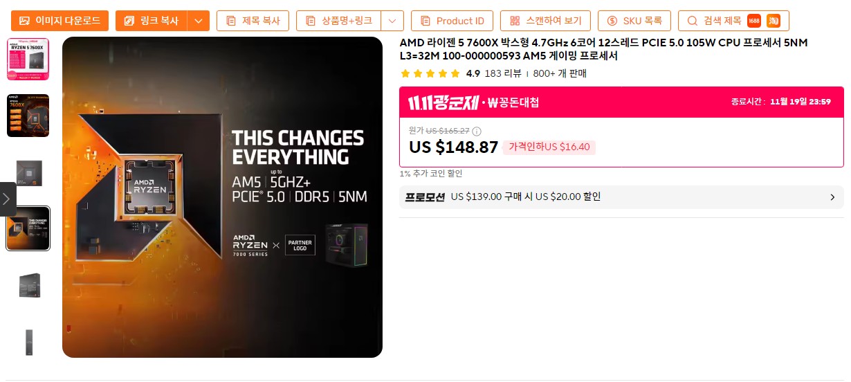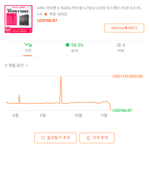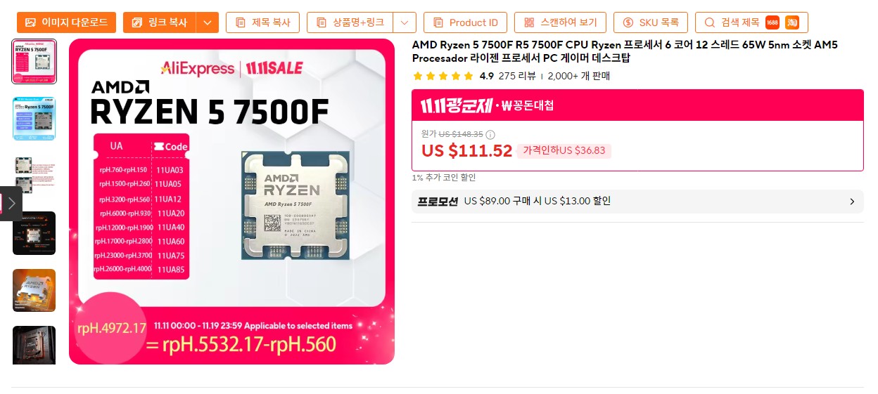 가성비 모델로 잘 알려진 라이젠5 7500F 는 위에는 전날 115.52 달러 였는데, 오늘은 또 110.66 달러로 그새 또 가격 변동이 되어있네요. 아마 또 바뀌겠죠.