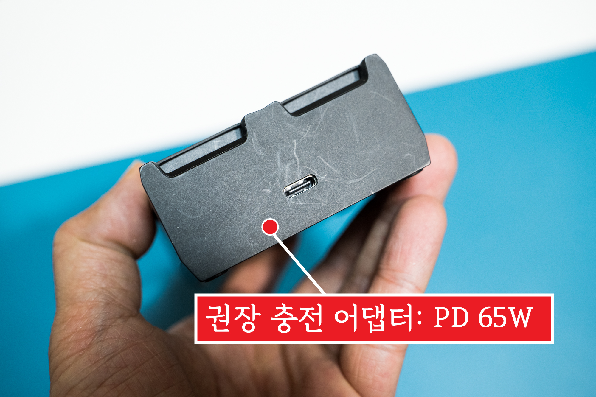 충전허브에는 배터리 2개를 한번에 충전이 가능한데, PD 65W 이상에서만 동시에 충전이 가능하고, 저는 집에 있는 제품으로는 하나씩 충전이 되더라구요.
