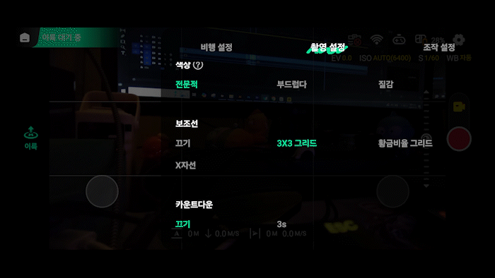 수동제어에서는 호버에어X1프로의 카메라 및 기체의 디테일한 설정들을 바꿀 수 있네요.
