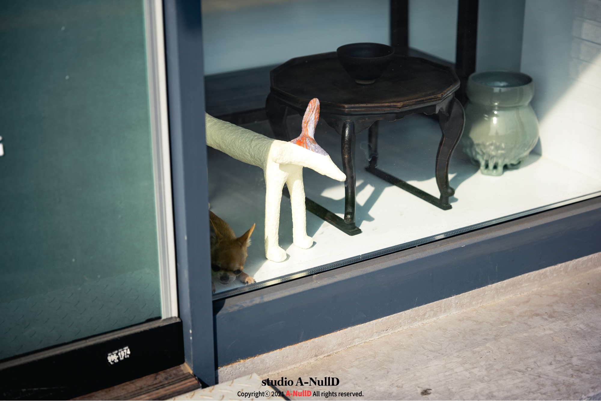 강아지 모양을 형상화 한 모형 옆으로 정말 강아지가 뒹굴고 있다.