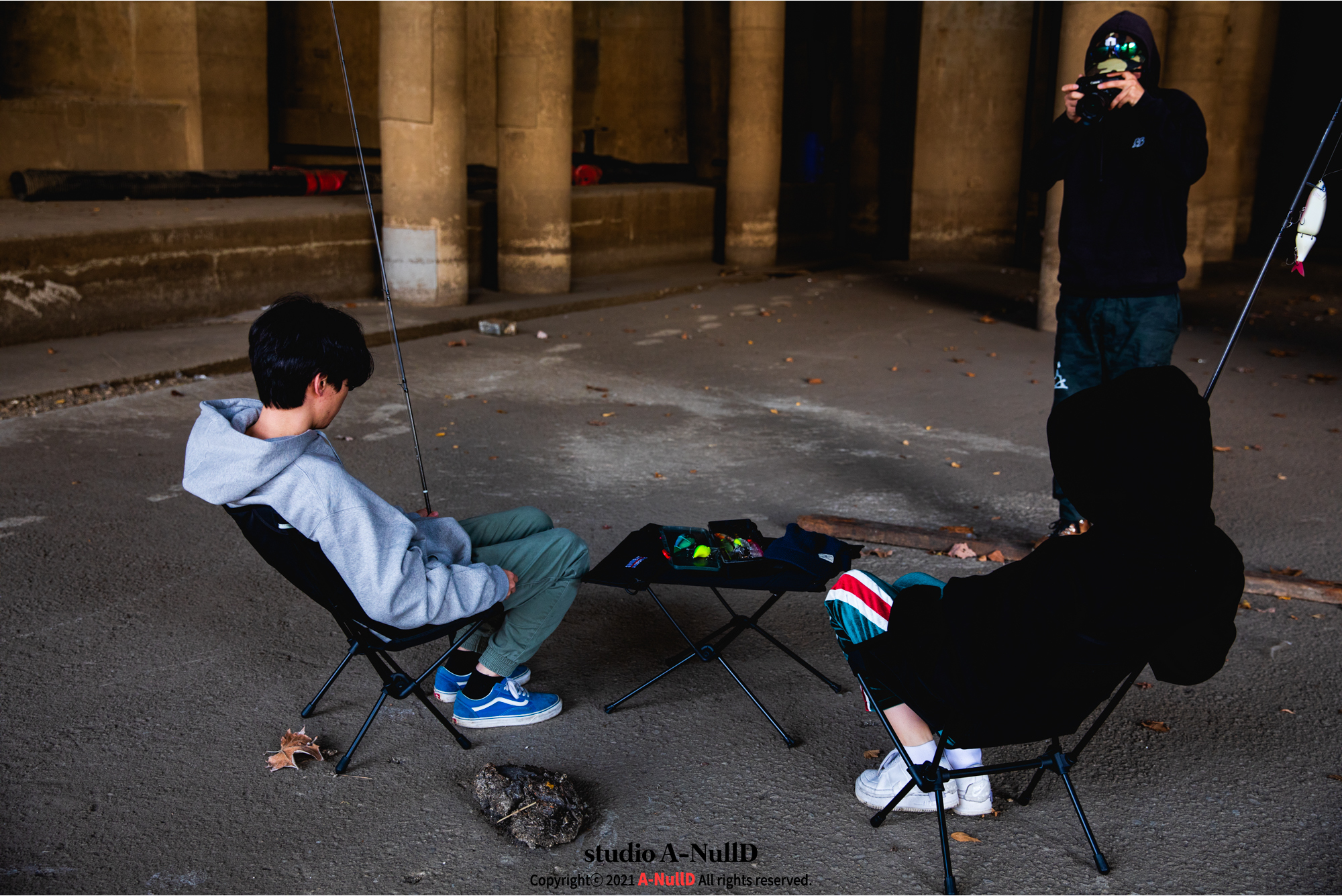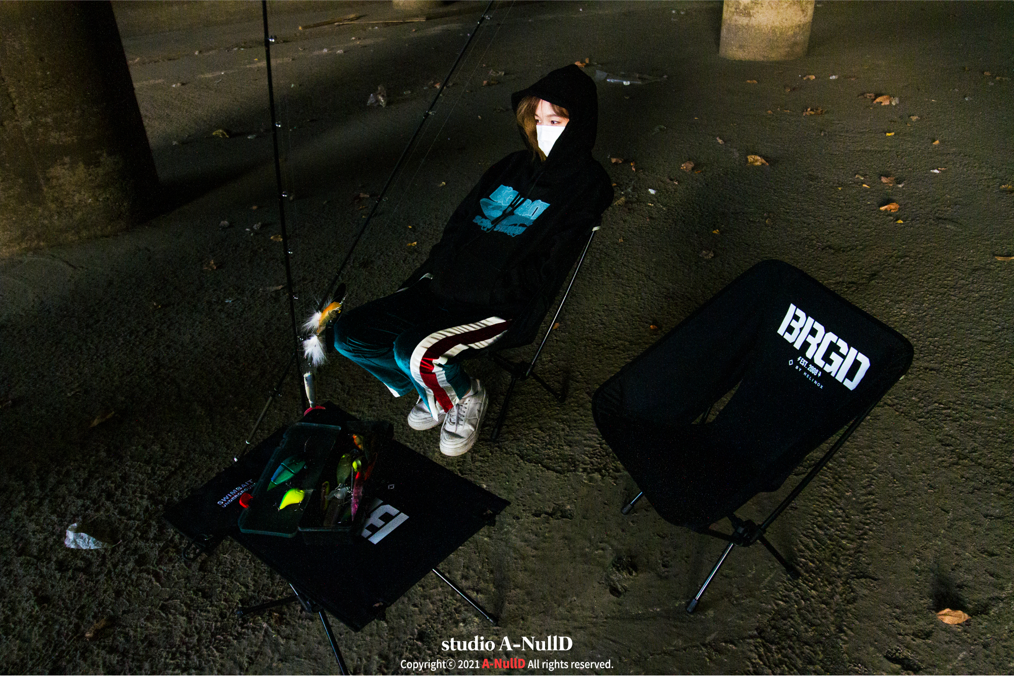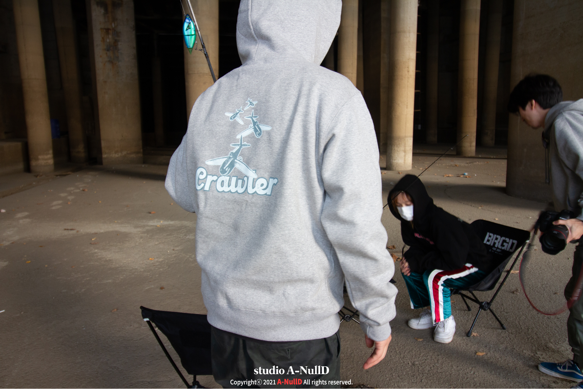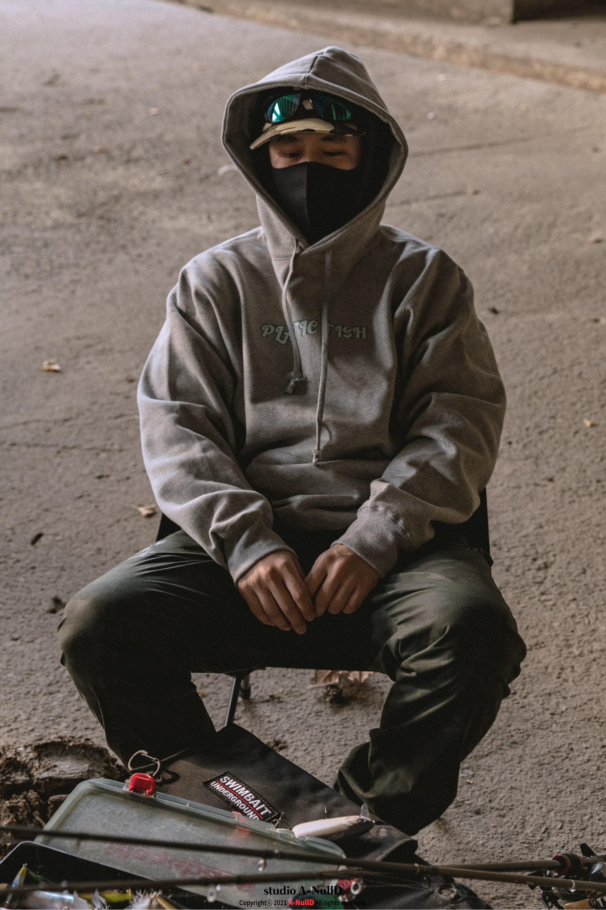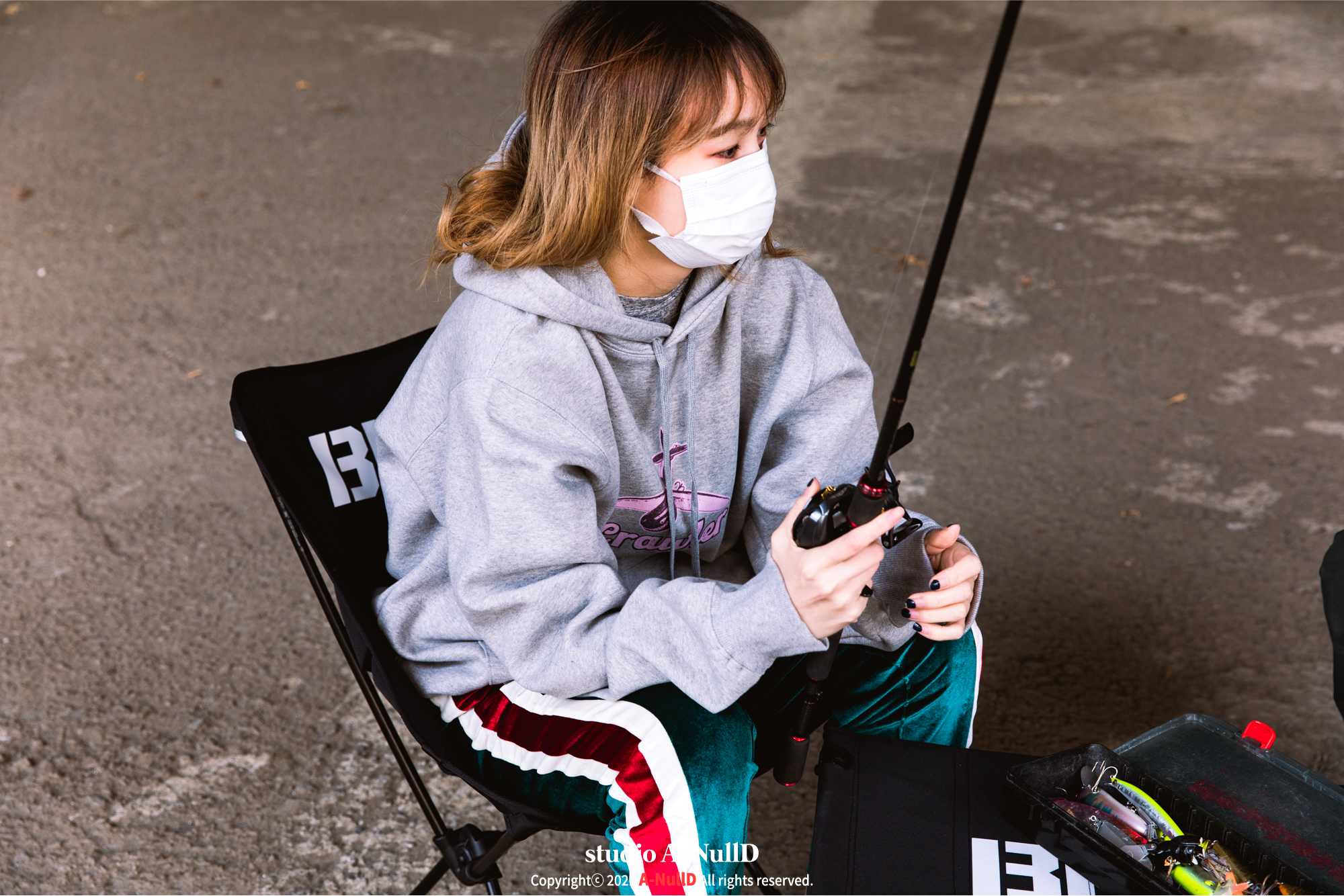 낚시 관련 디자인 답게 낚시대와 관련된 소품들을 들고 촬영을 진행했다.