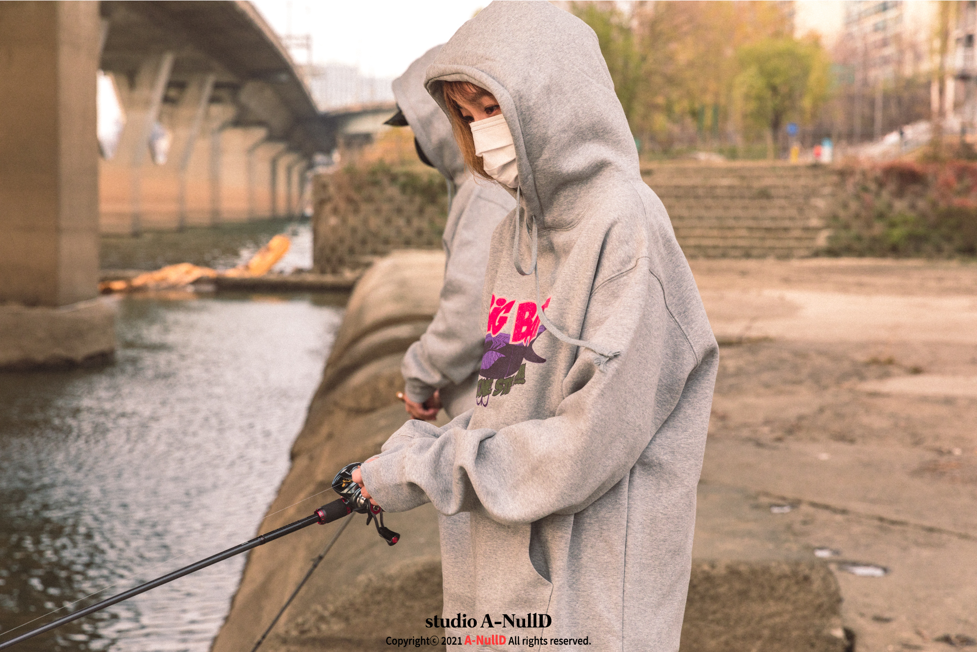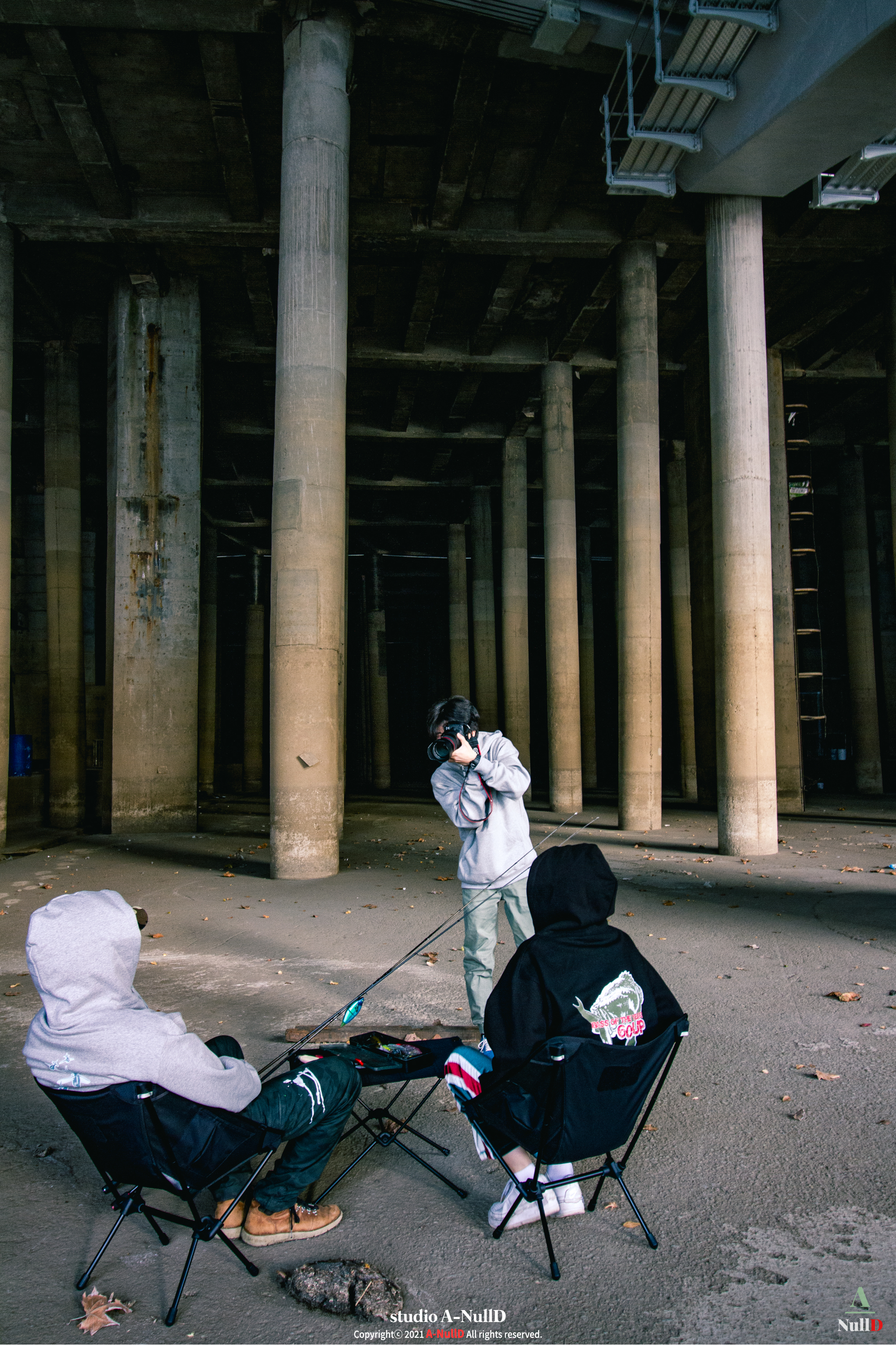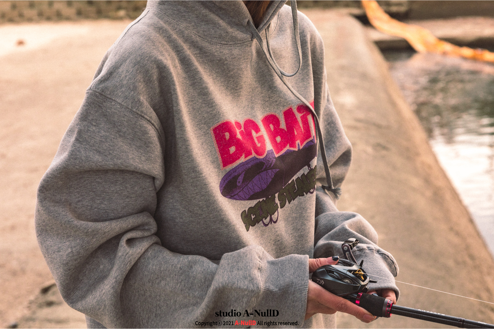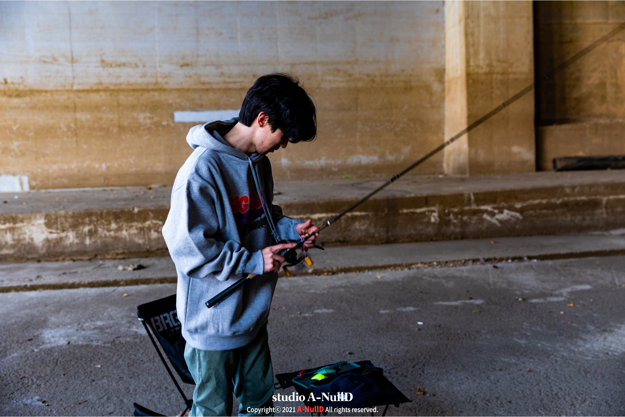 낚시 관련 디자인 답게 낚시대와 관련된 소품들을 들고 촬영을 진행했다.
