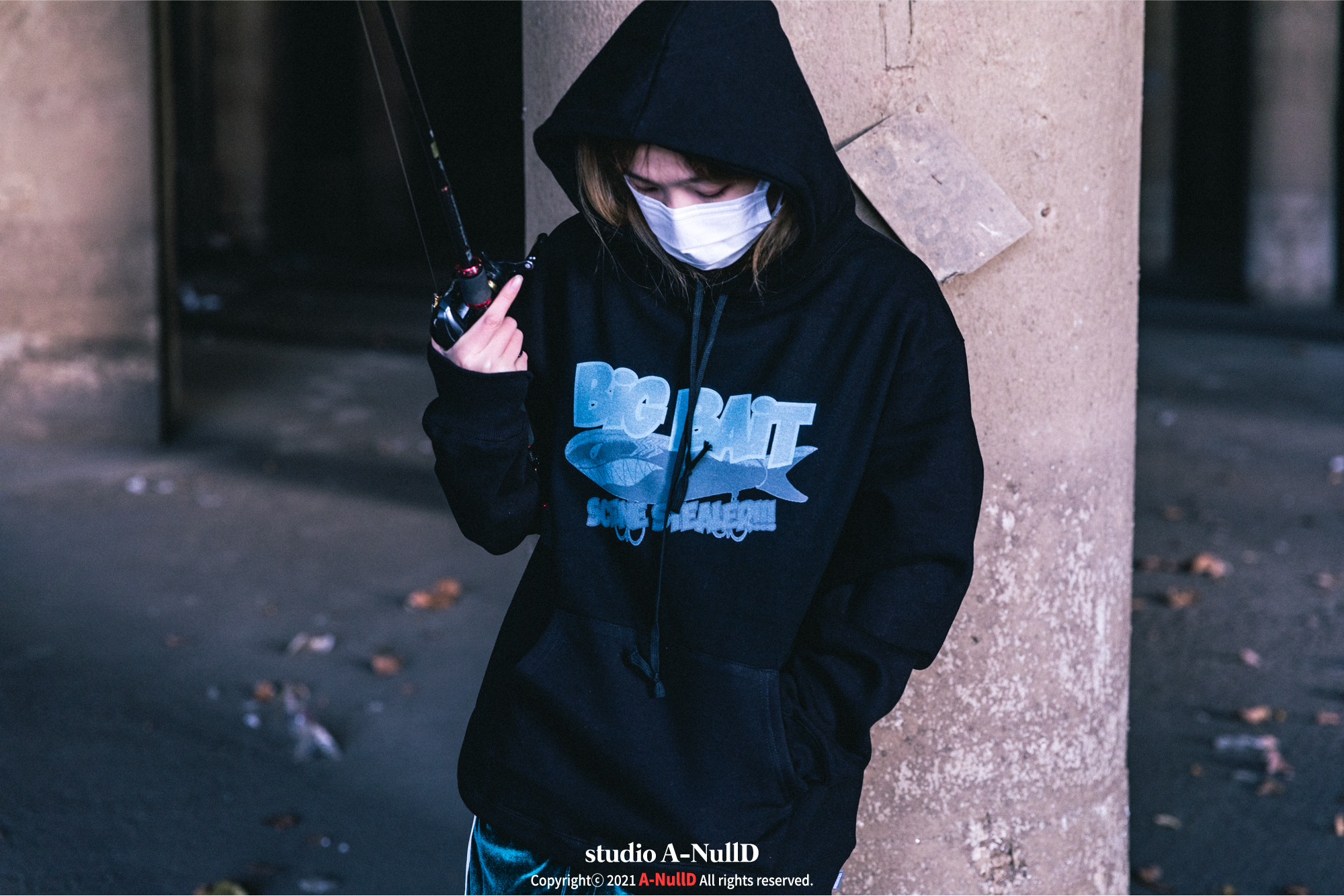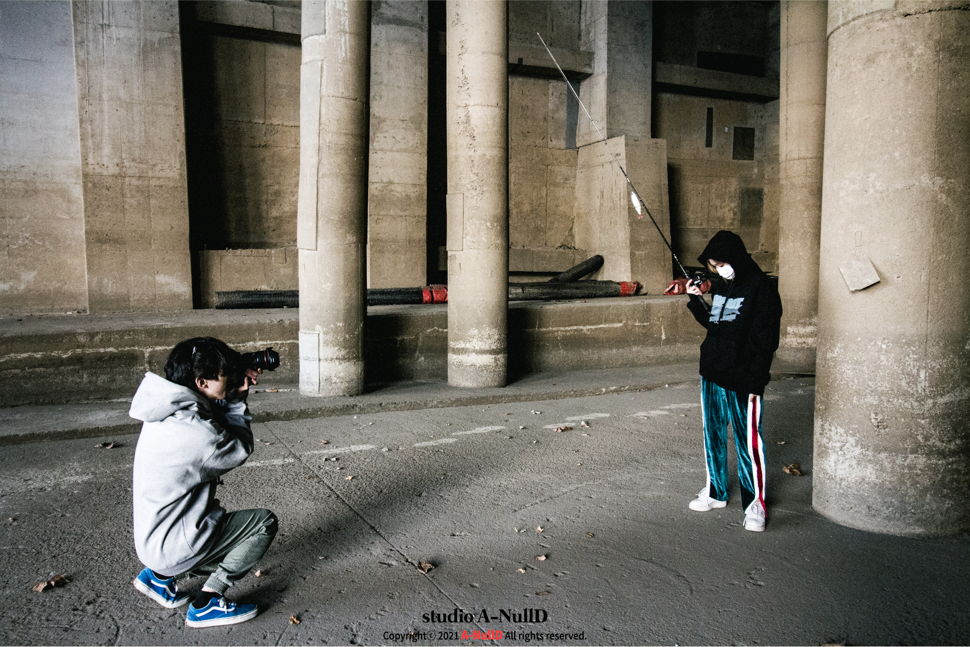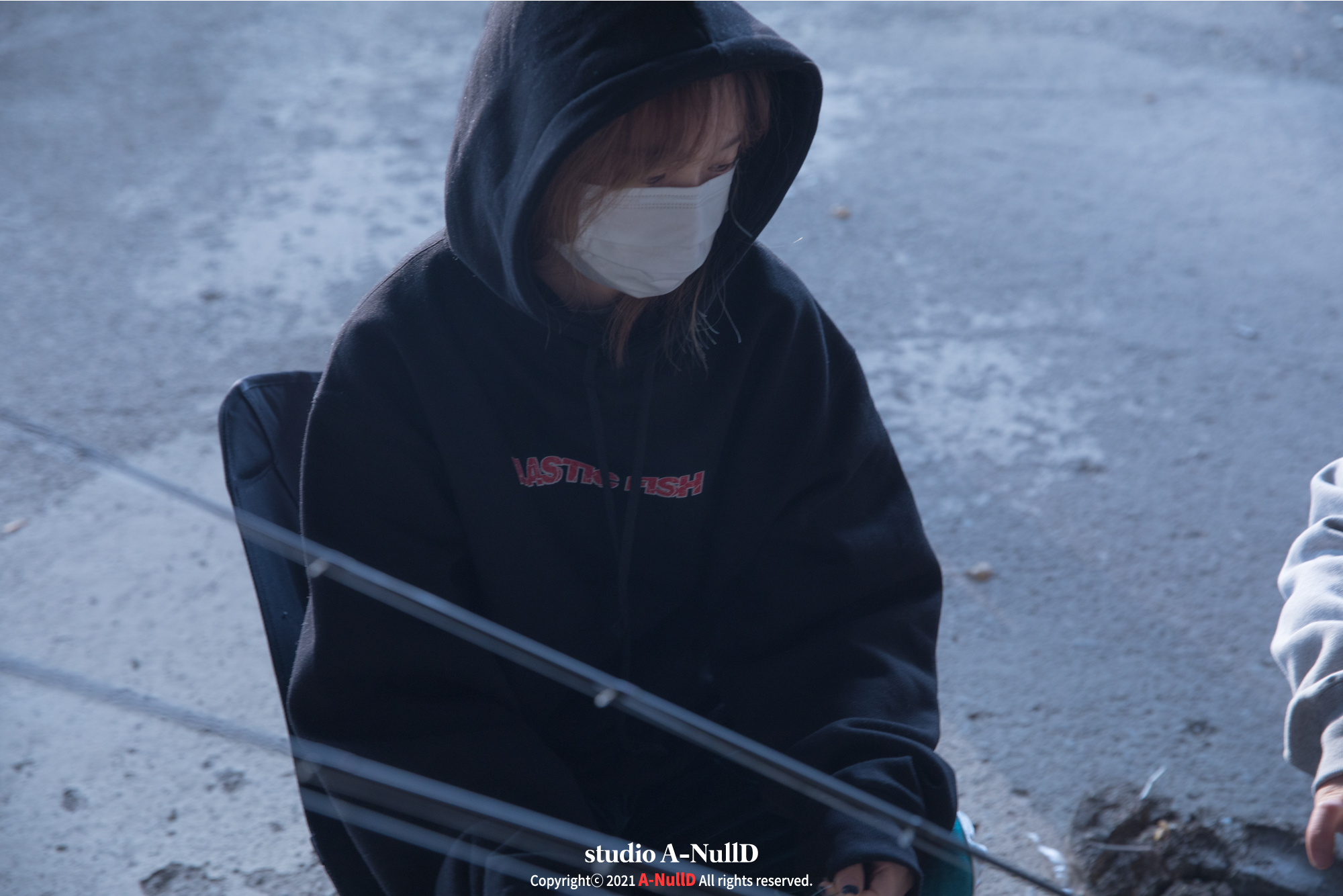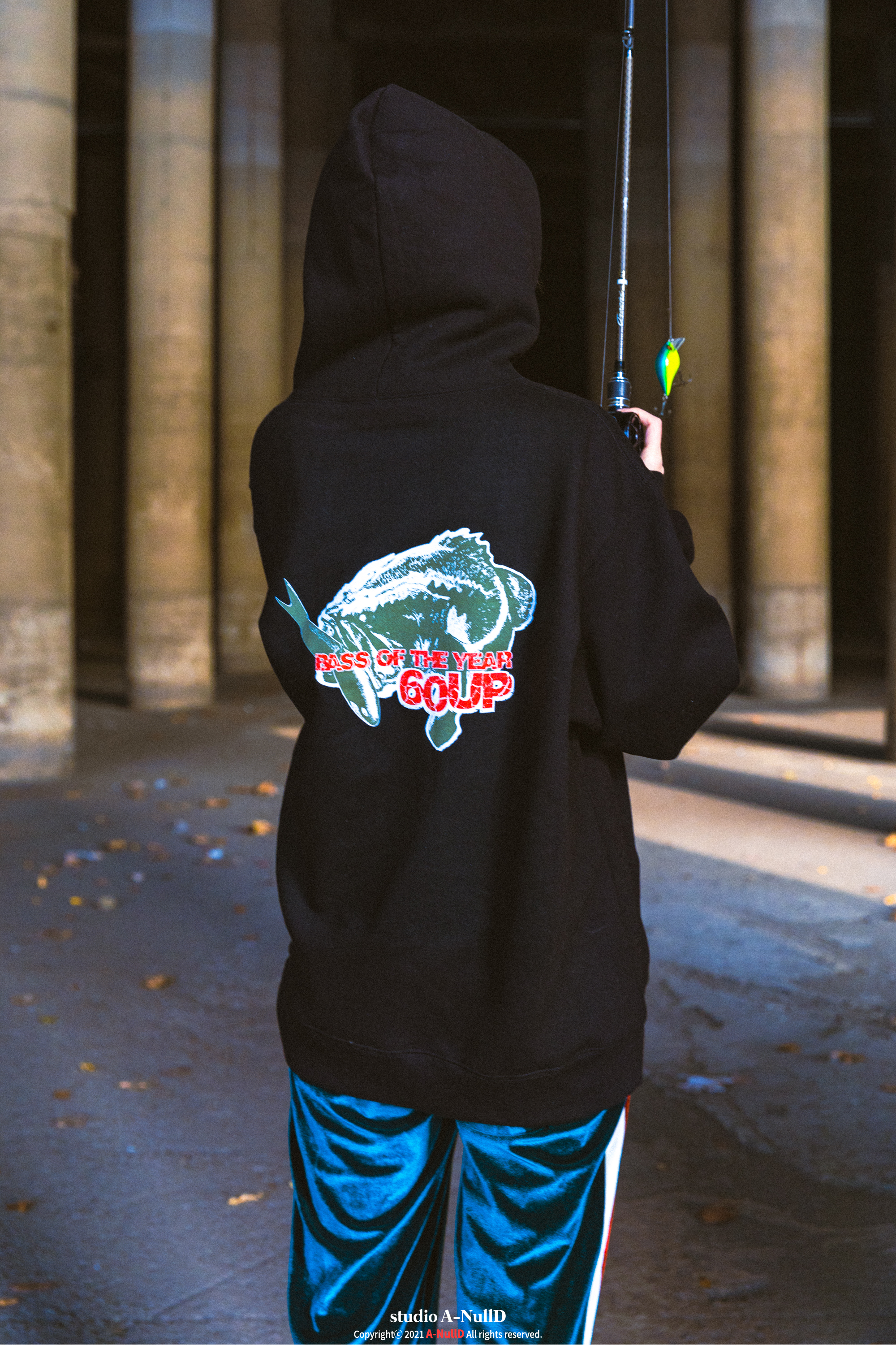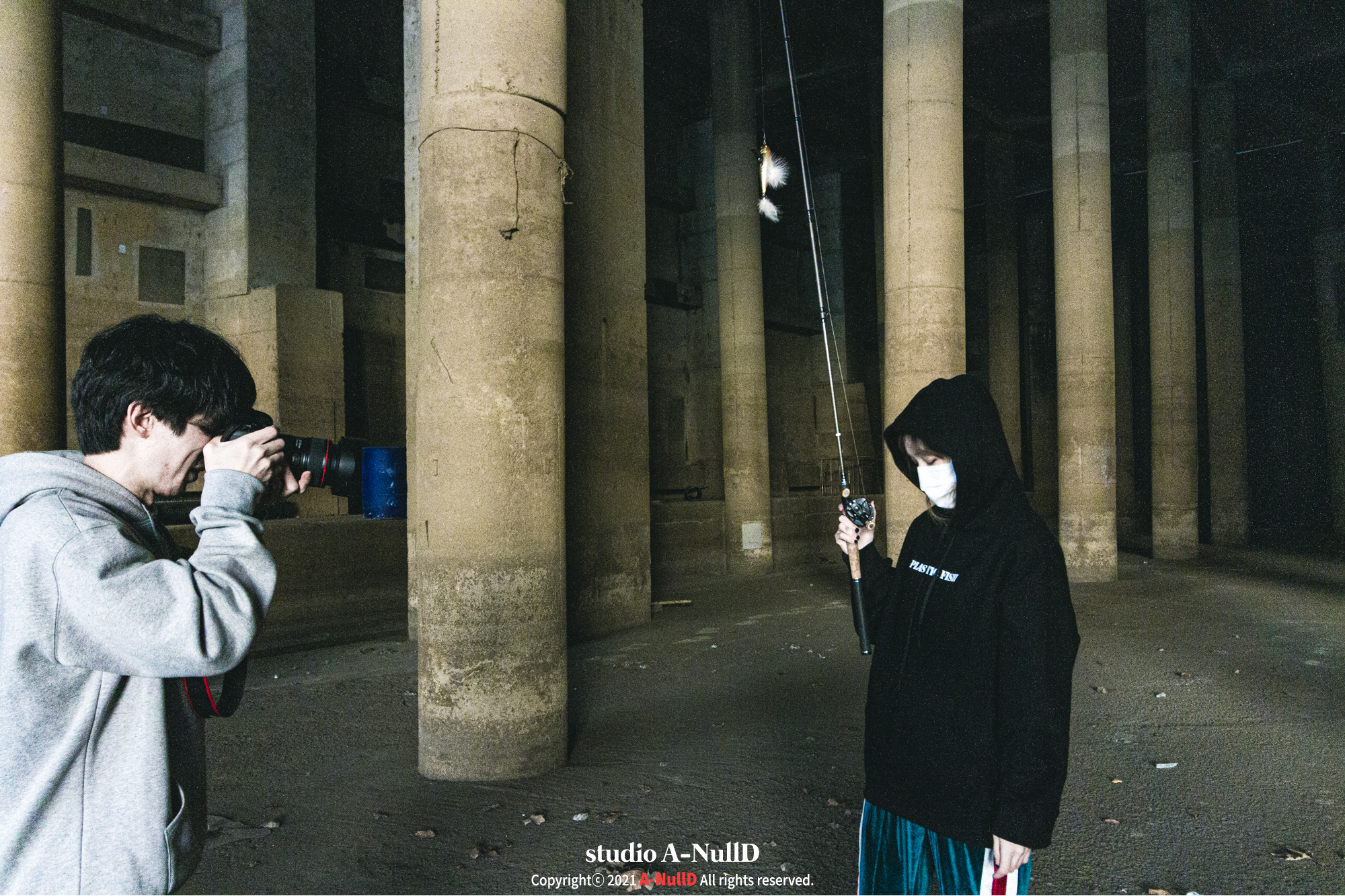 낚시 관련 디자인 답게 낚시대와 관련된 소품들을 들고 촬영을 진행했다.