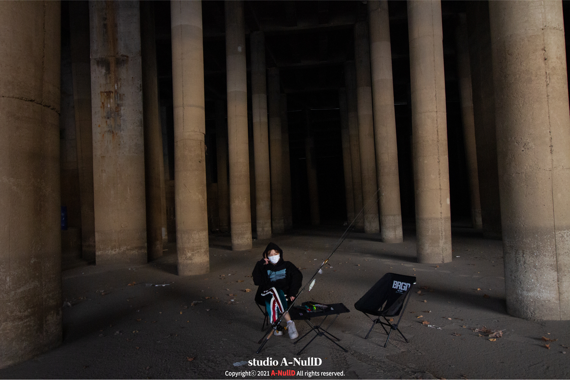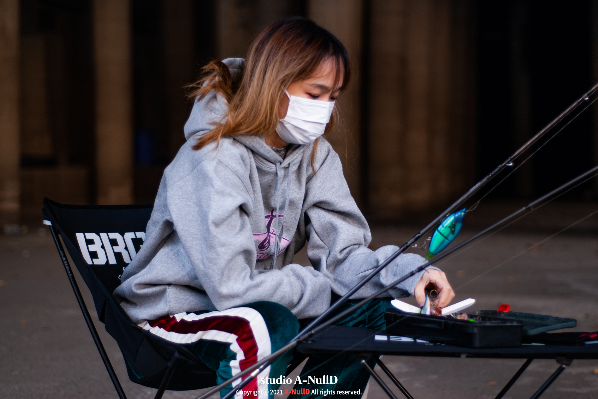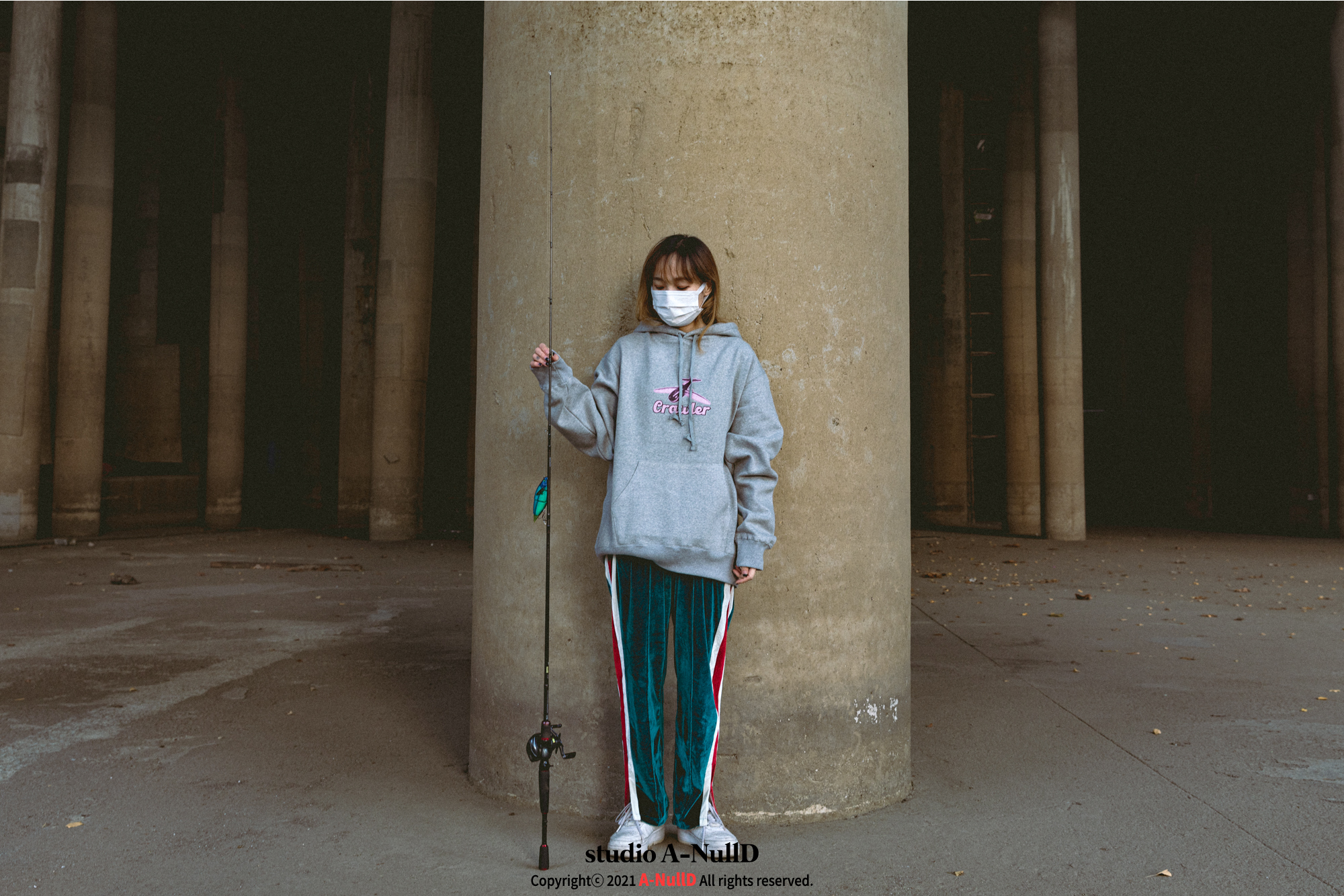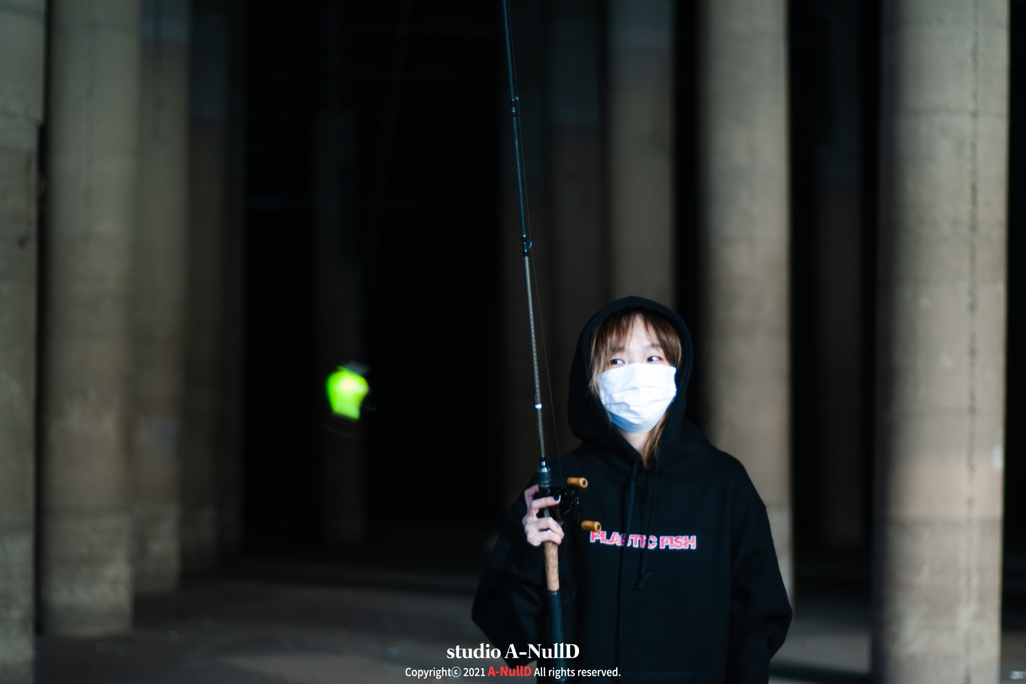 낚시 관련 디자인 답게 낚시대와 관련된 소품들을 들고 촬영을 진행했다.