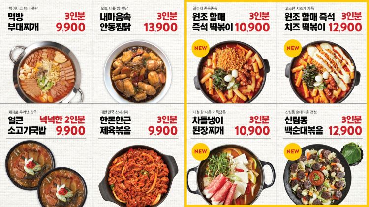 메뉴는 부대찌개, 찜닭, 떡볶이, 소고기국밥, 제육볶음, 된장찌개, 순대볶음까지... ...