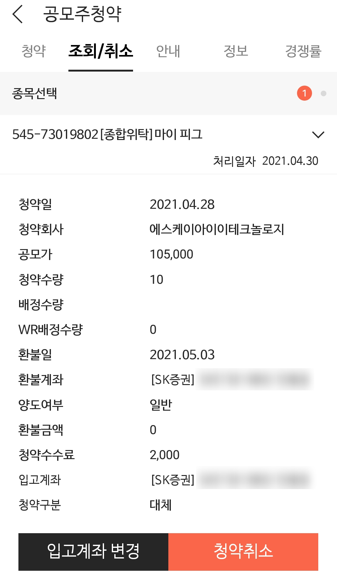예전 CMA 때매 만들어 놓았던 SK증권에서의 청약 신청은 균등배정 물량에 못 미쳐서