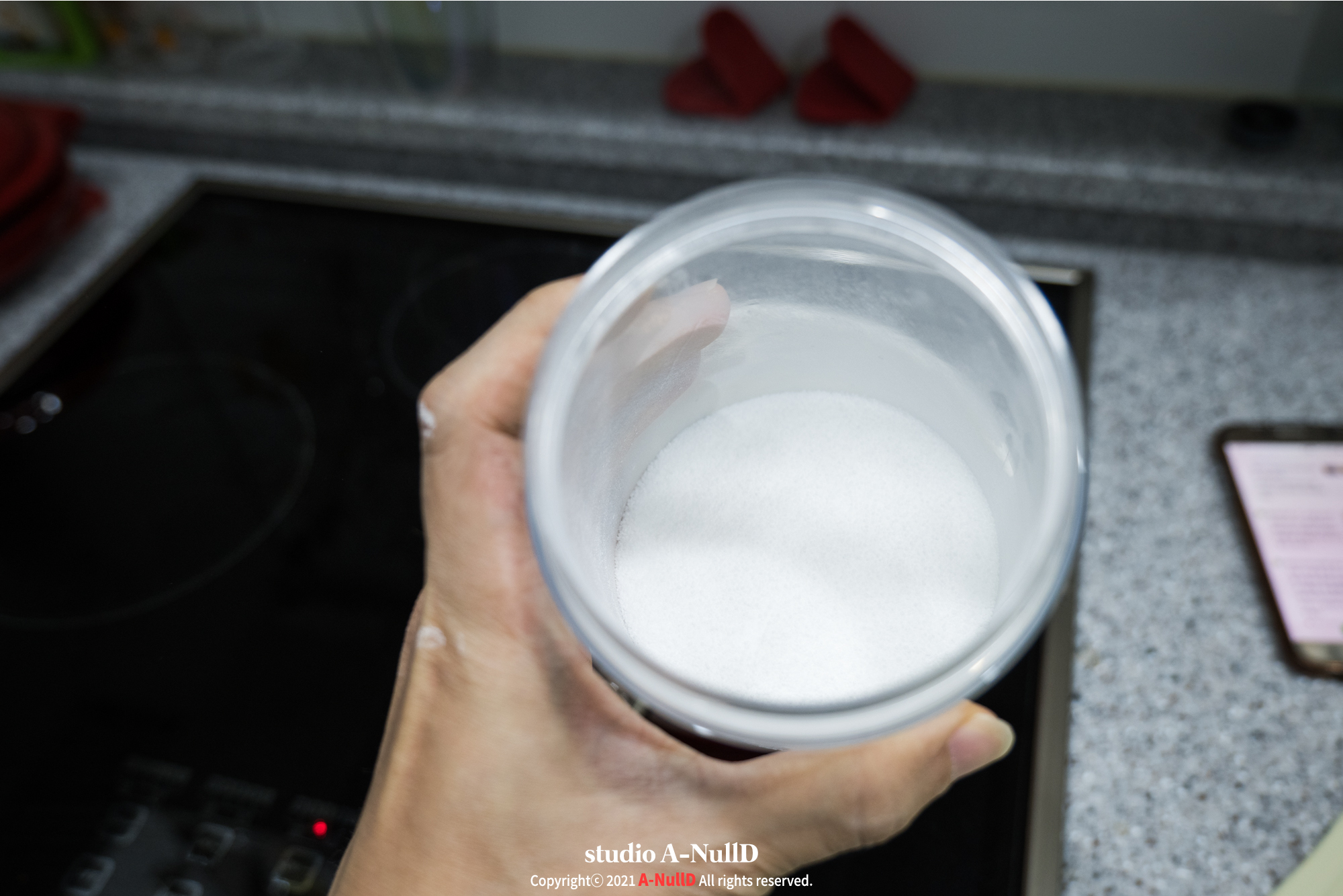 오일을 뿌려준뒤에 통에 넣고 흔들며 섞었다.