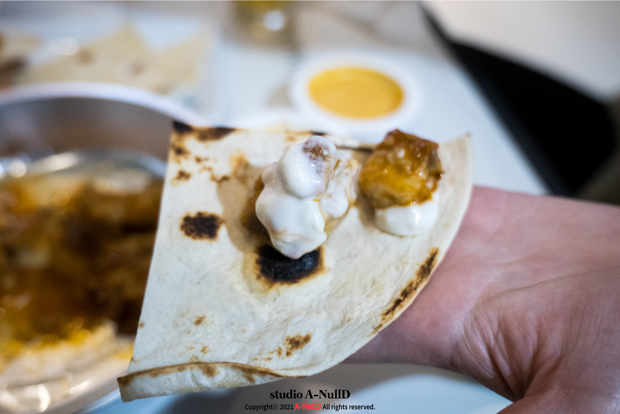 또치닭과 또띠아(1/4조각 4개) 그리고 요거트디핑소스.