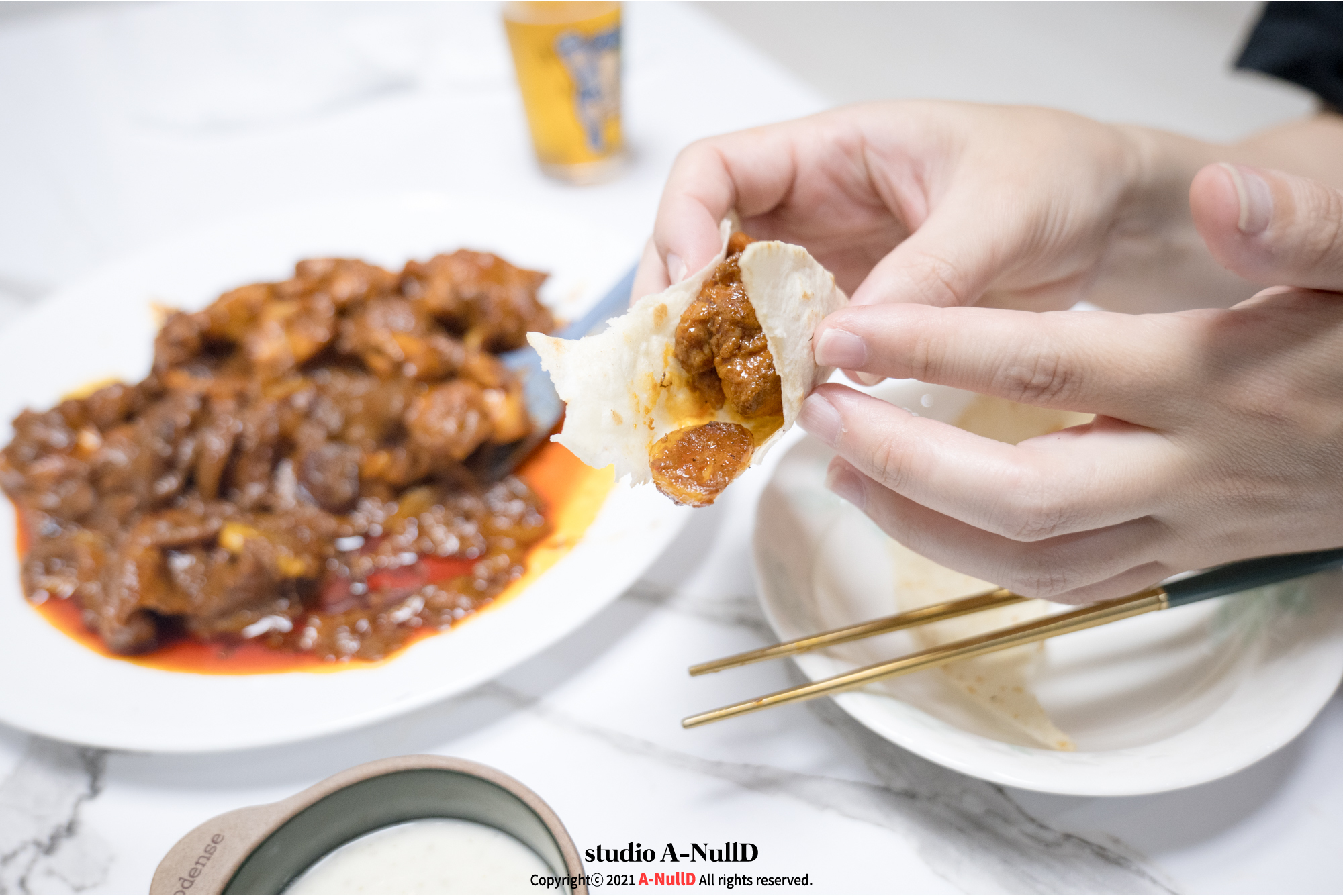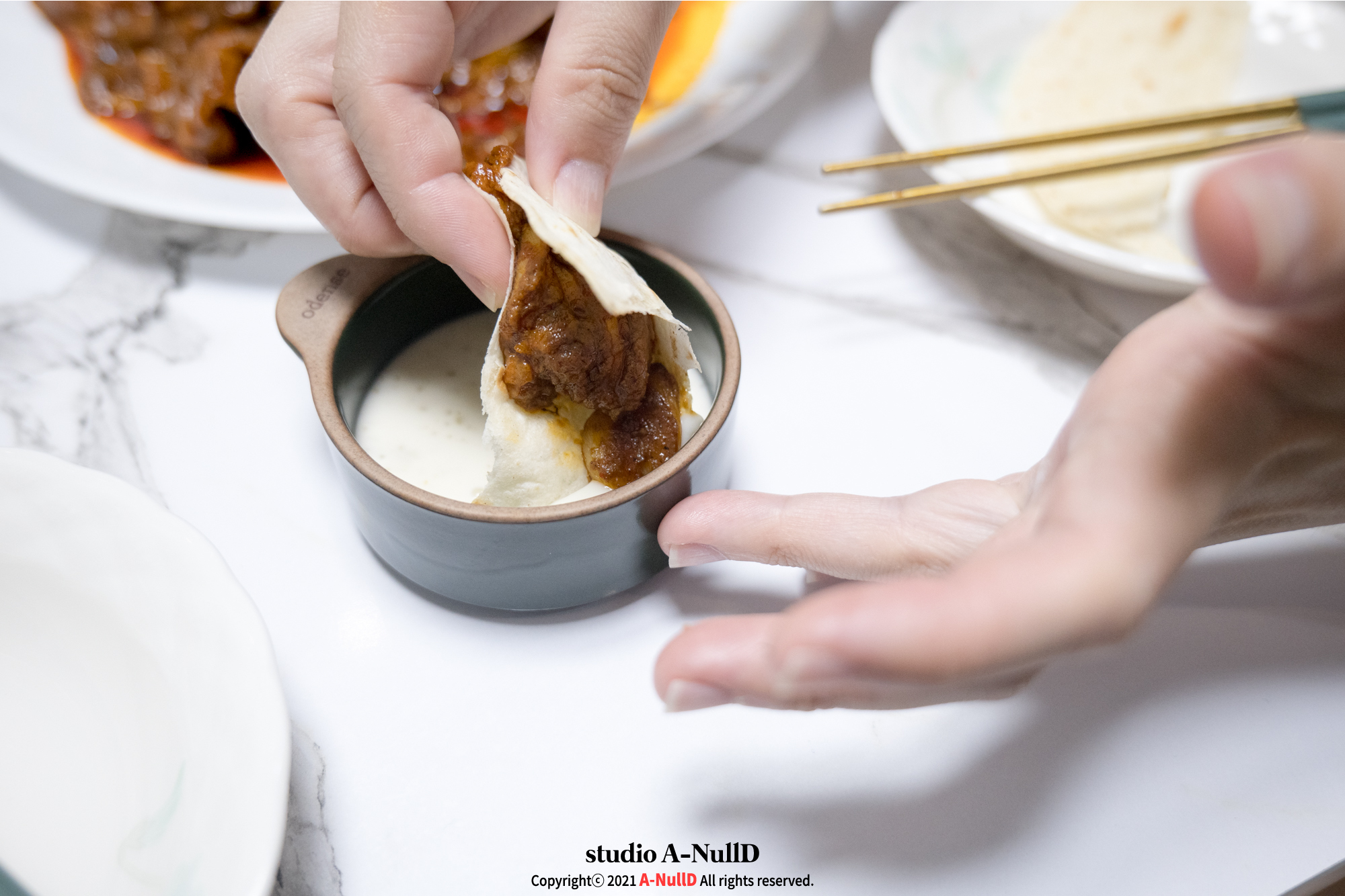 소스를 듬뿍 찍어...