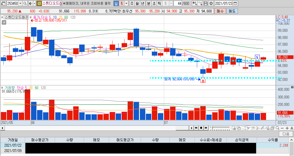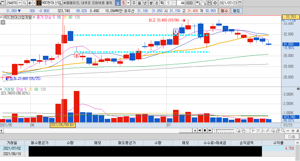 거래량이 뛰어 기다림 없이 그냥 매도했는데,